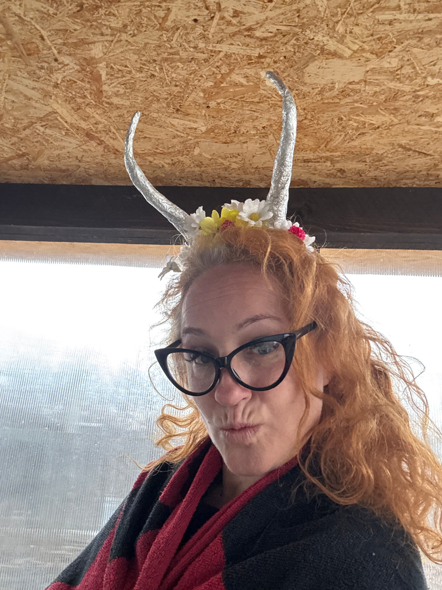 A woman with red hair is wearing glasses and a headband with silver horns and artificial flowers. She is pouting and looking towards the camera. The background consists of a wooden wall and a window w…read more