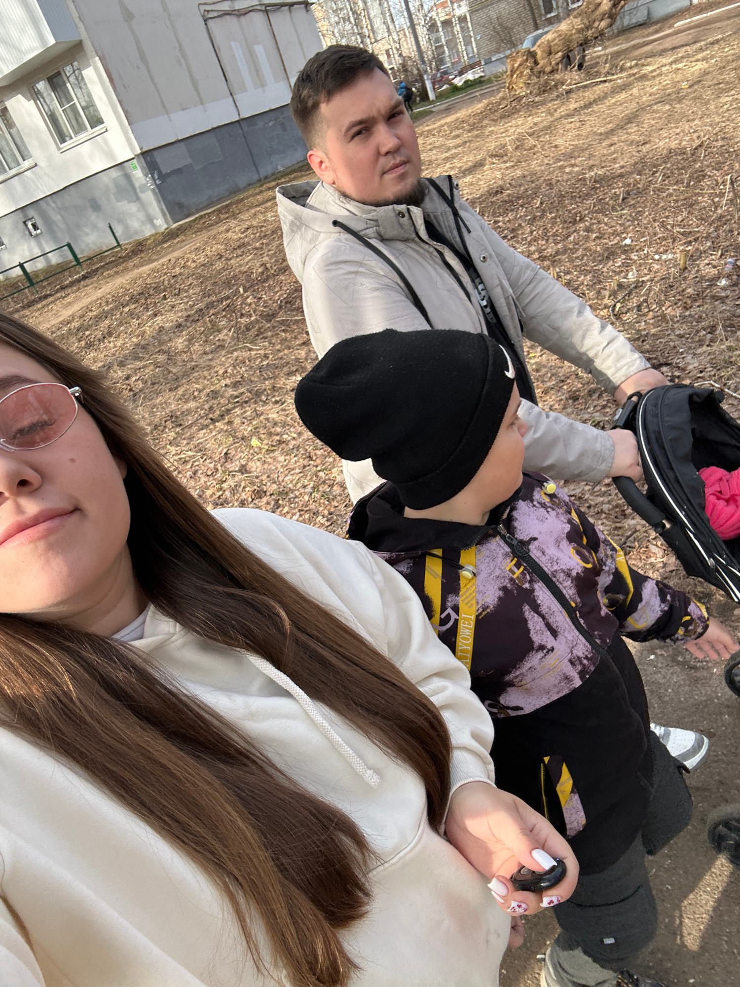 The image shows a selfie taken by a person with long brown hair, wearing rose-tinted glasses and a white hoodie. The person is lying down outdoors, with their head angled towards the camera. Behind th…read more
