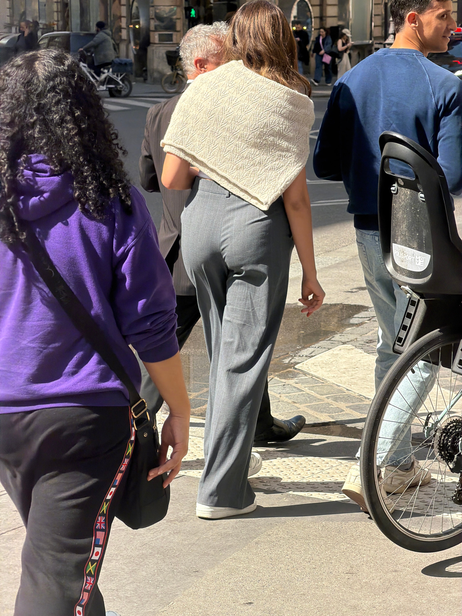 The image shows a street scene. A man in a blue shirt is standing next to a bicycle. Nearby, a woman in a grey outfit and a beige sweater is visible. In the foreground, another person with curly hair…read more