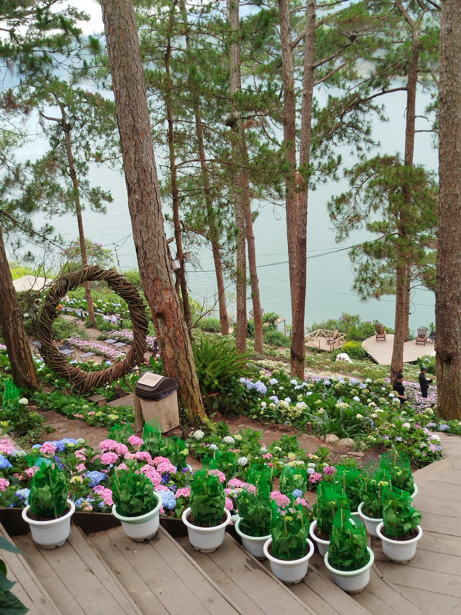 The photo depicts a flower garden in Da Lat, Vietnam, overlooking a body of water. The garden is on a slope with steps in the foreground leading down. On the steps are several white pots containing gr…read more
