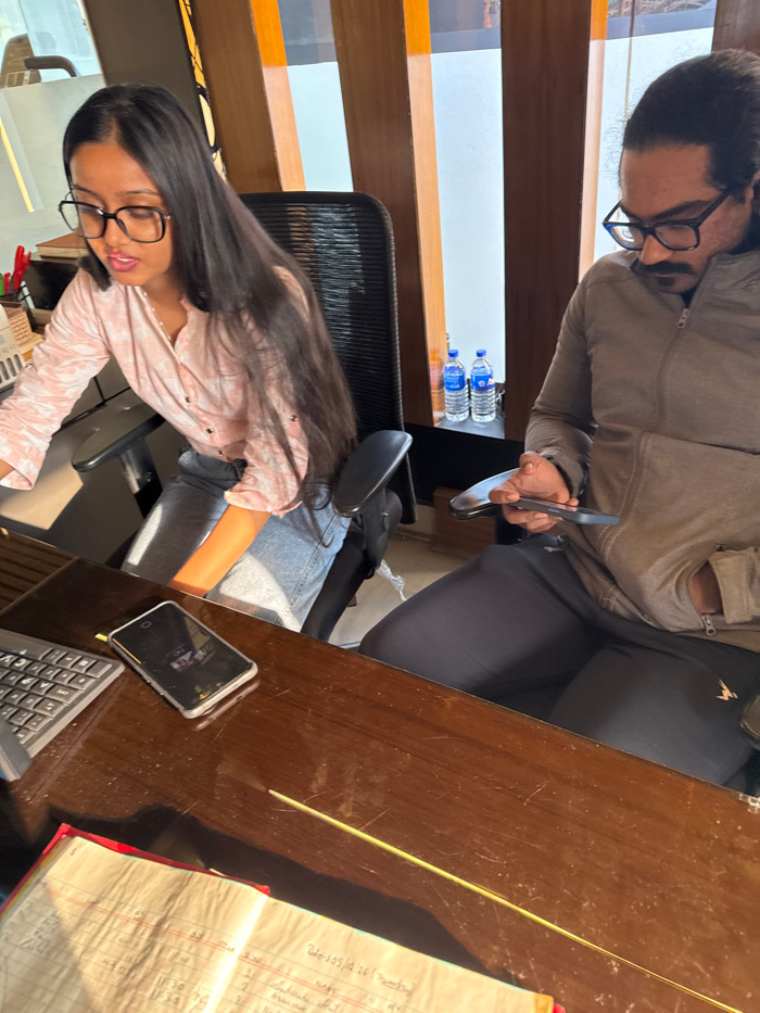 Two people are sitting at a desk. One person wears a brown jacket while looking at a phone. The second person is seated at the desk wearing a pink patterned shirt and glasses and working at a keyboard…read more