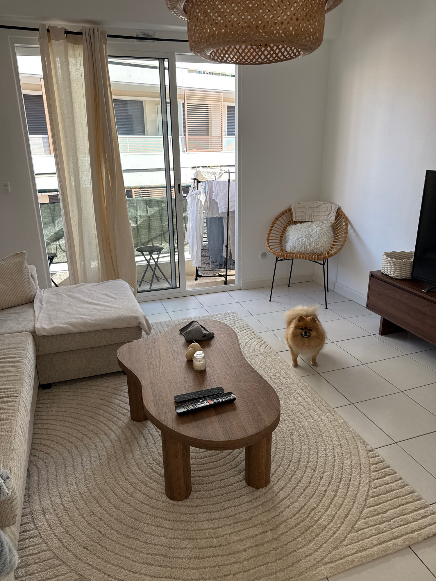 The image depicts an interior scene. A Pomeranian dog stands on a cream-colored rug with an organic pattern. The rug is placed in front of a light-colored sofa. A wooden coffee table with remotes and small objects sits on the rug near the sofa. In the background, a window with beige curtains leads to a balcony with a clothes rack. Outside the balcony, buildings are visible. The objects and setting suggest a modern apartment. The location is specified as Cannes, France. | Open Wire
