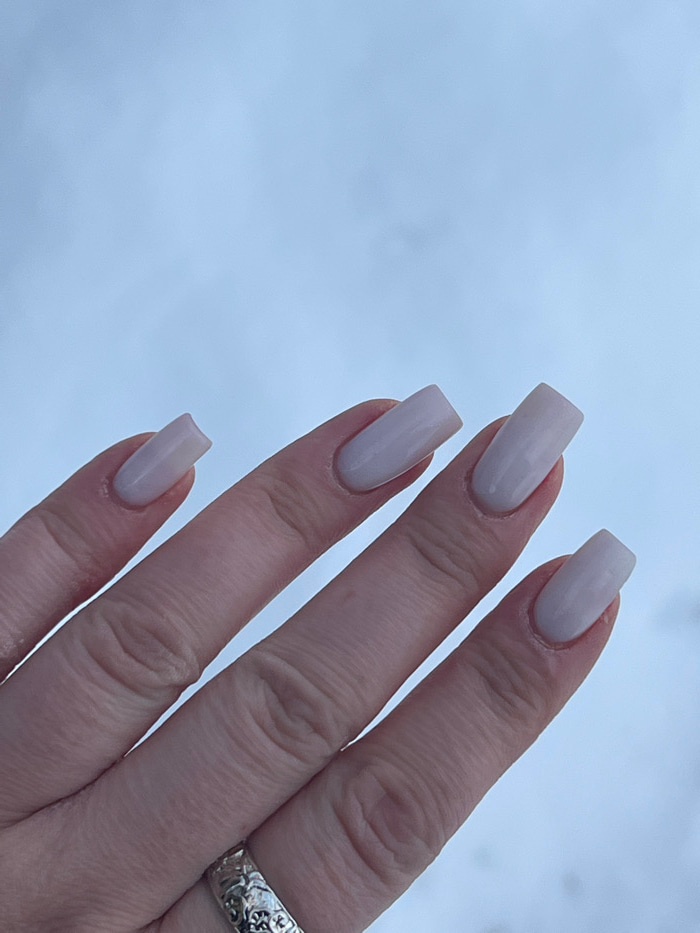 A fair-skinned hand is prominently displayed against an undifferentiated light blue-grey background, indicative of an outdoor environment, possibly an overcast sky or distant snow, precluding identifi…read more