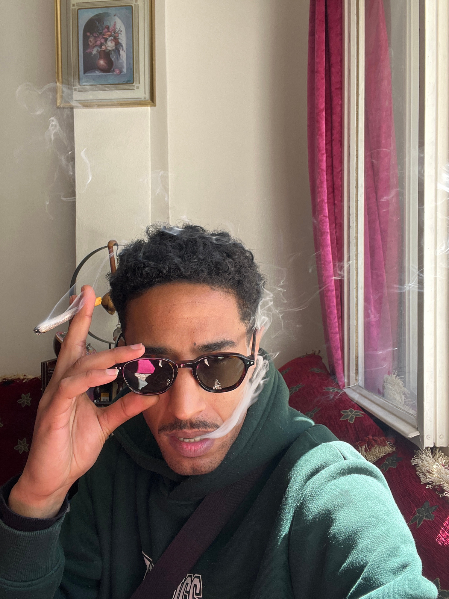 A person with curly black hair and dark skin is holding a lit cigarette/joint in their right hand, which is producing smoke. They are wearing sunglasses and a green hoodie. In the background, there's…read more