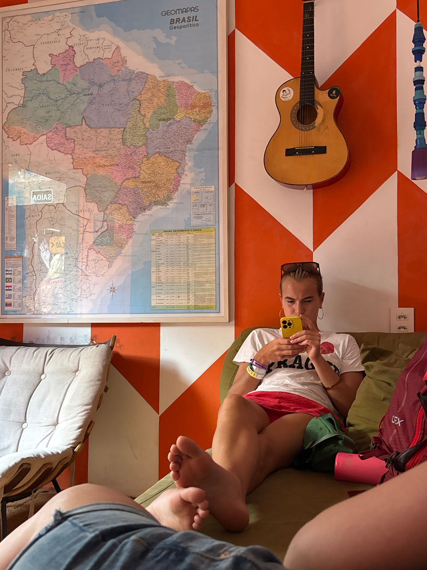 A horizontally-oriented, medium-shot photograph depicts a young woman seated on a plush cushion, intently using a yellow smartphone. She is wearing a white t-shirt with writing on it, red shorts, and…read more