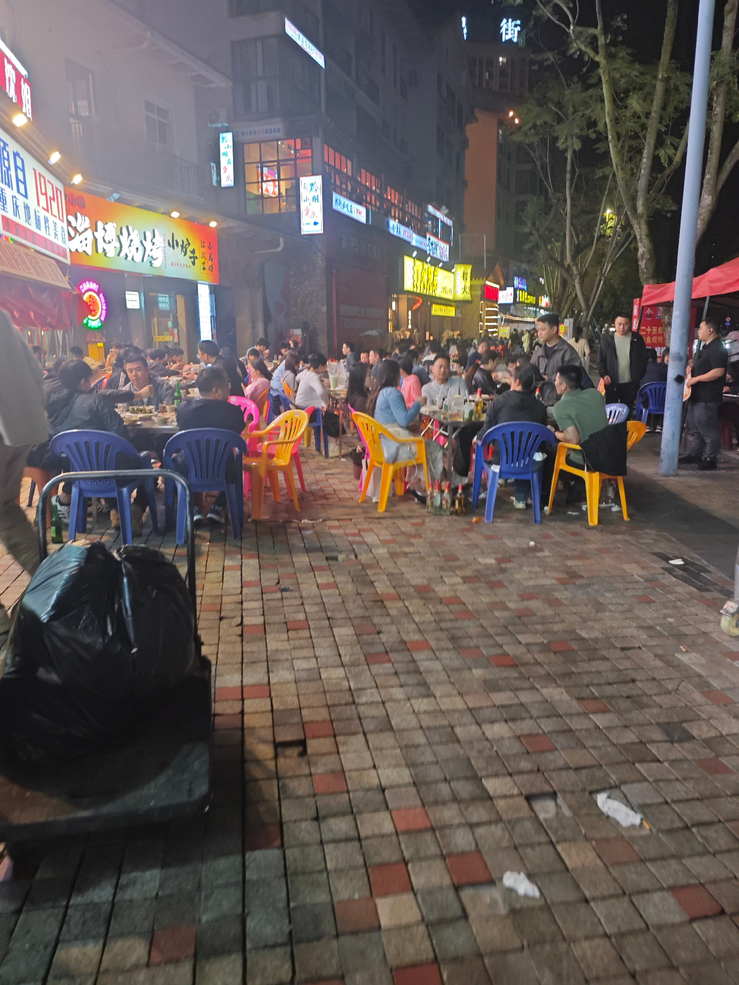 The image shows a nighttime street scene in Chongqing High-tech Zone, China. Numerous people are seated at outdoor tables, eating and socializing. Tables are surrounded by colorful plastic chairs (blue, yellow, pink). Restaurants with bright signage line the street in the background. People are of various ages and are engaged in eating, drinking, and conversation. A trash-filled bag on a wheeled cart is in the foreground. The street is paved with interlocking brick pavers in brown, gray, and red tones. Some litter is scattered on the ground. The light level is relatively high due to the signage and streetlights. Trees are visible in the background. | Open Wire