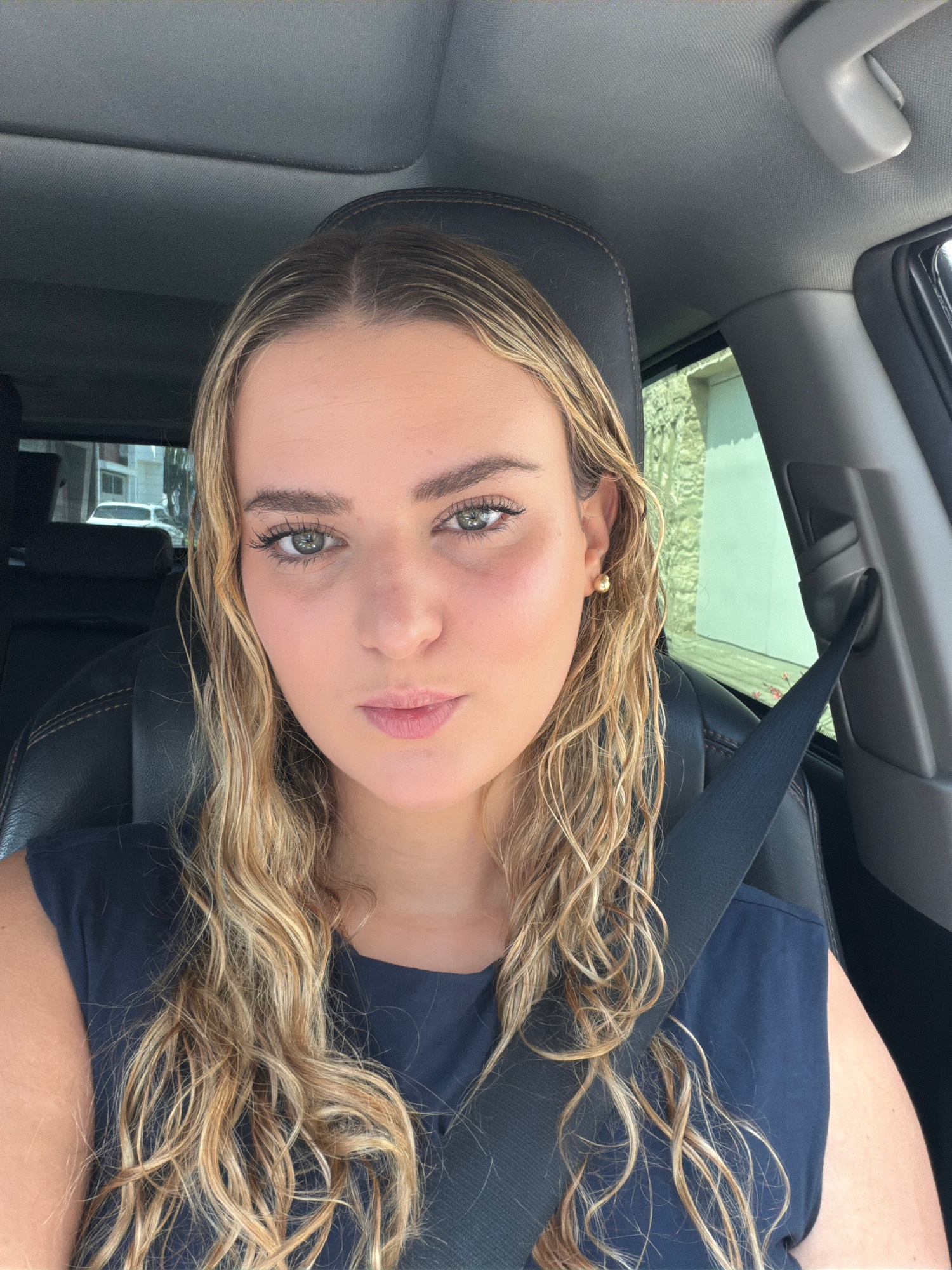 A young woman with blond, curly hair is in the driver's seat of a car, wearing a blue shirt and a seatbelt. She is looking directly at the camera. The interior of the car is visible, including the das…read more
