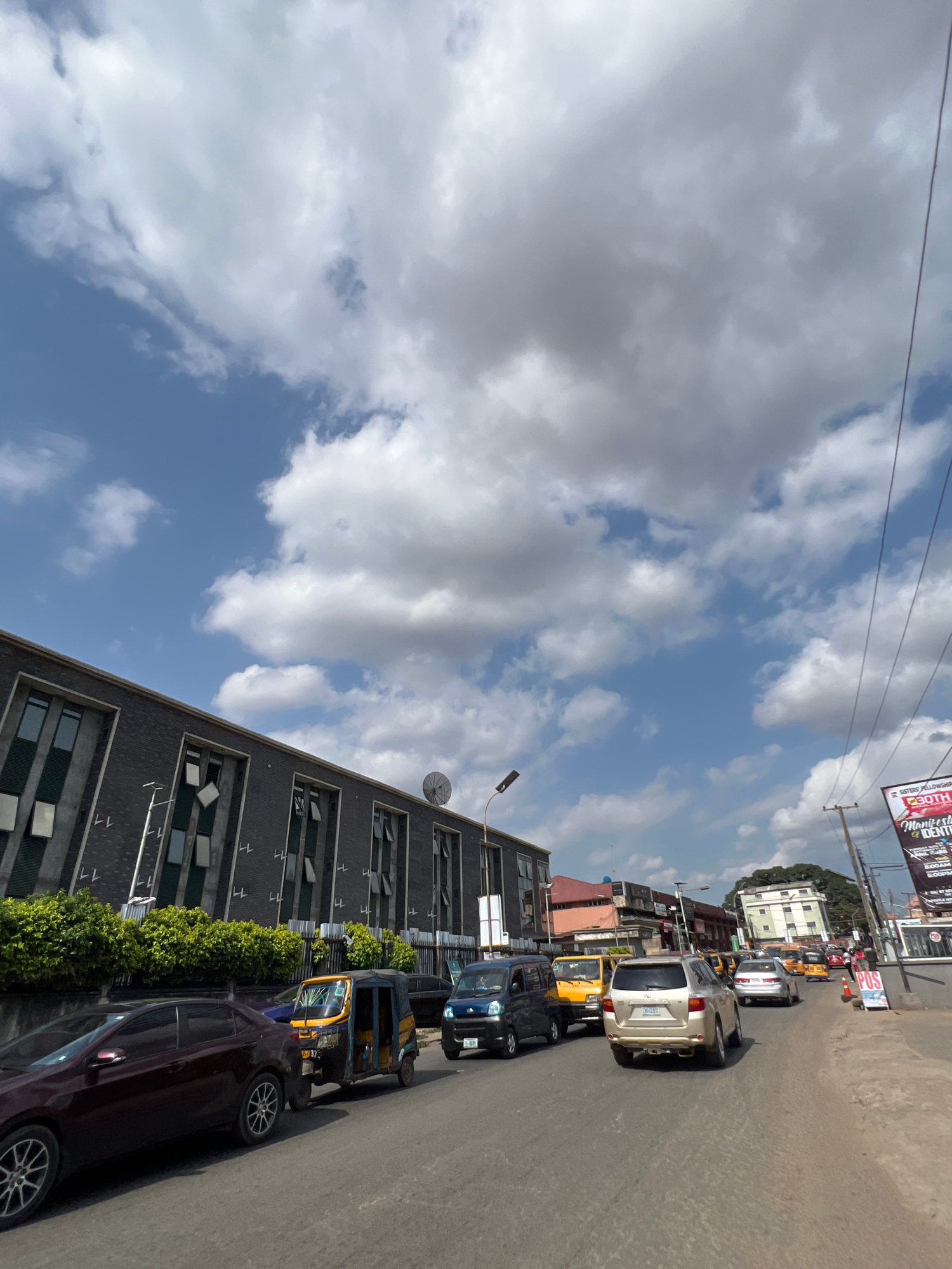 This image captures a vibrant urban street scene in Onitsha, Nigeria, under a bright, partly cloudy sky. The photograph is tilted clockwise, presenting the ground and buildings at an angle. In the up…read more