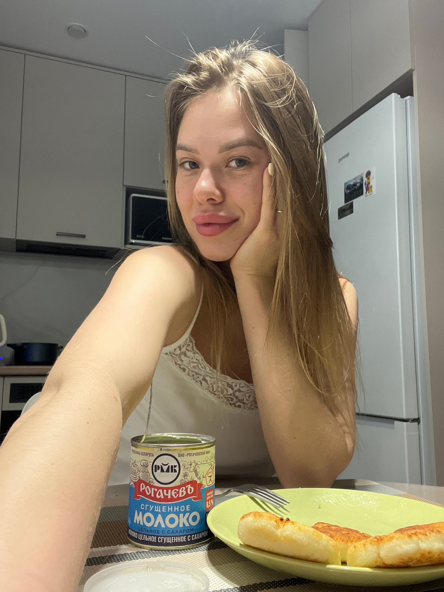 A young woman with long blonde hair is facing the camera, holding up a can of "Rogachev" condensed milk. She is in a kitchen with white cabinets and appliances. On the counter, there is a green plate…read more
