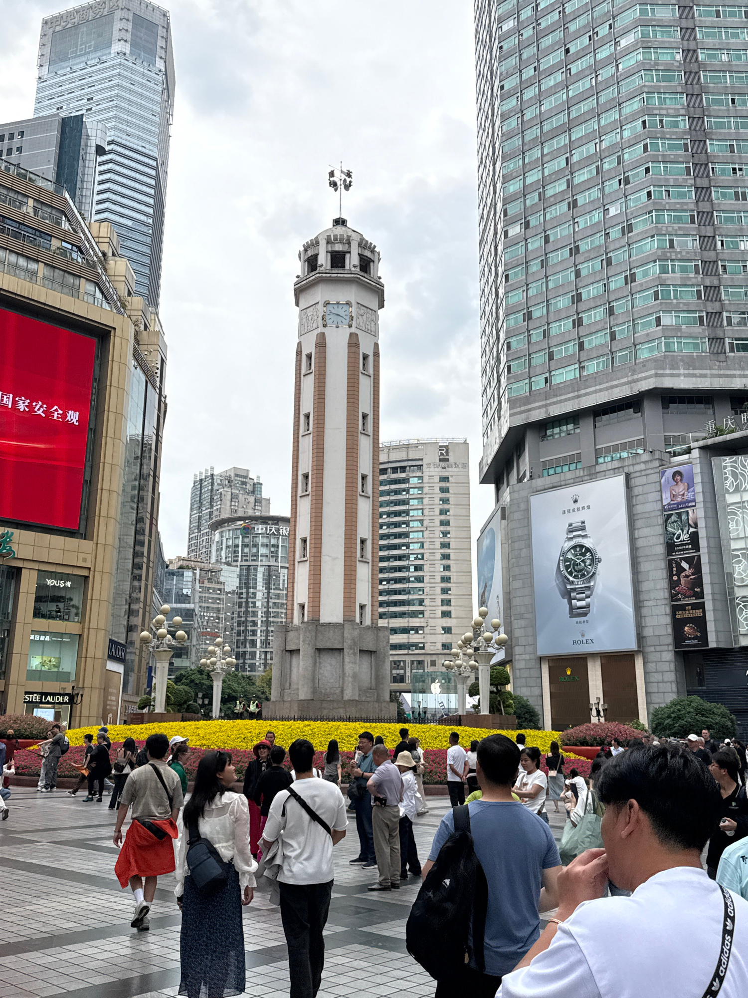 The image captures a bustling street scene in Yuzhong District, Chongqing, China, with a mix of architecture, commercial elements, and pedestrian activity. A prominent clock tower rises in the center…read more