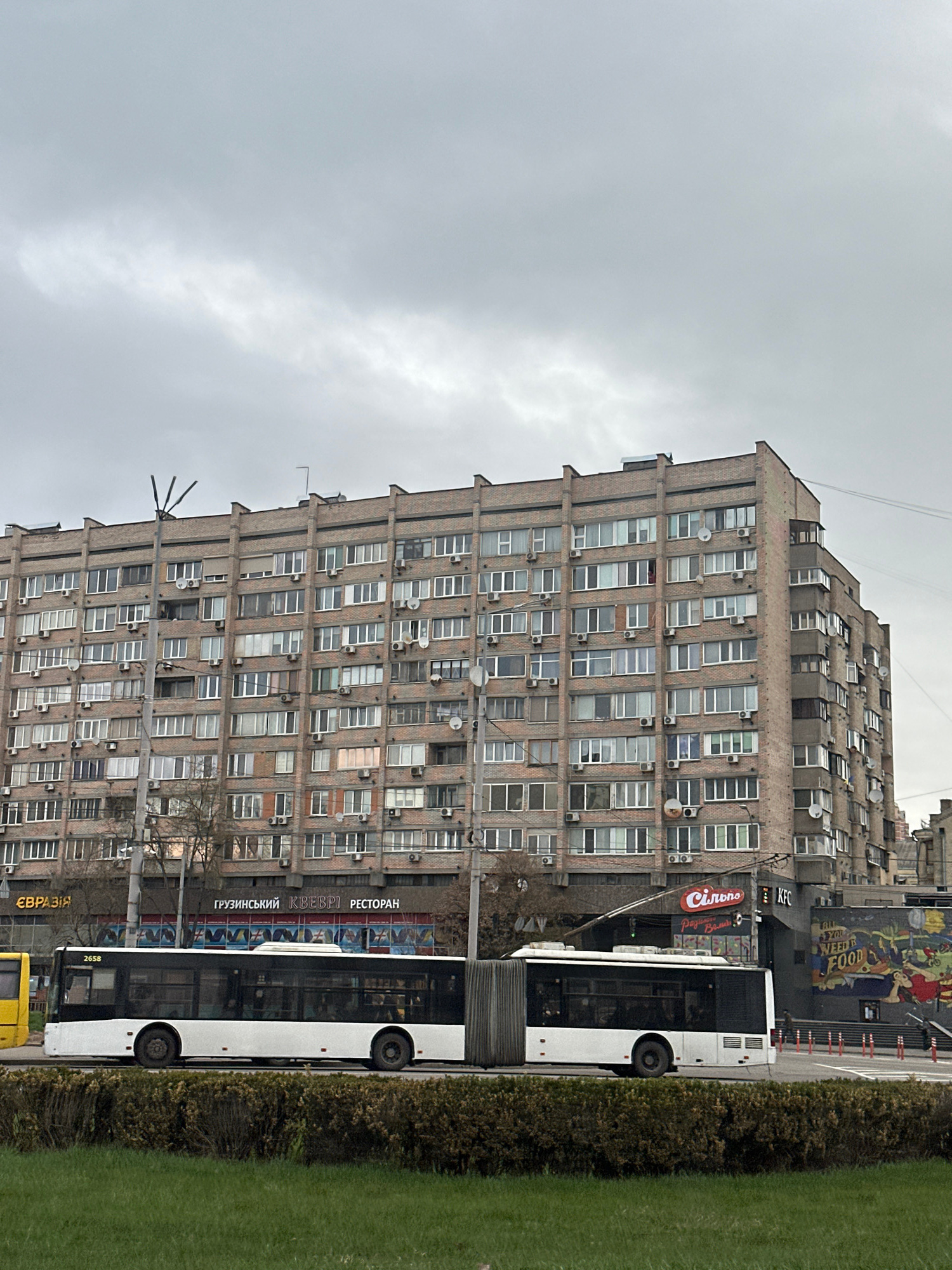 The photograph shows a multi-story building in Kyiv, Ukraine. The building is constructed of brick and has numerous windows, many of which have air conditioning units. A white public bus is parked alo…read more