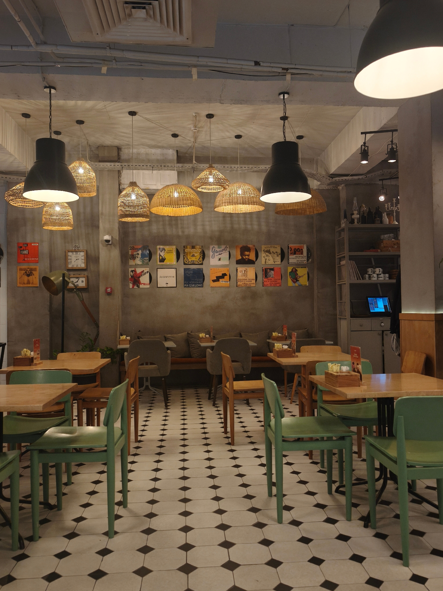 The image depicts an indoor setting, likely a restaurant or cafe, located in Bishkek City, Kyrgyzstan. The foreground shows several tables with light-colored wooden tops and green chairs arranged arou…read more