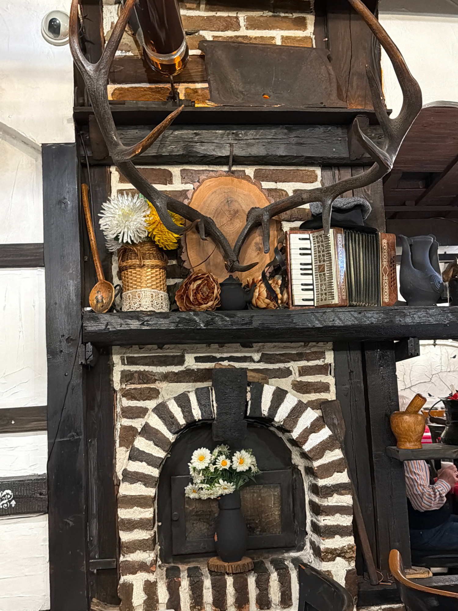 The image shows an indoor, overhead shot of a wall display. The wall is constructed of black and white half-timbered sections and brickwork. A pair of antlers is prominently displayed on the left side…read more