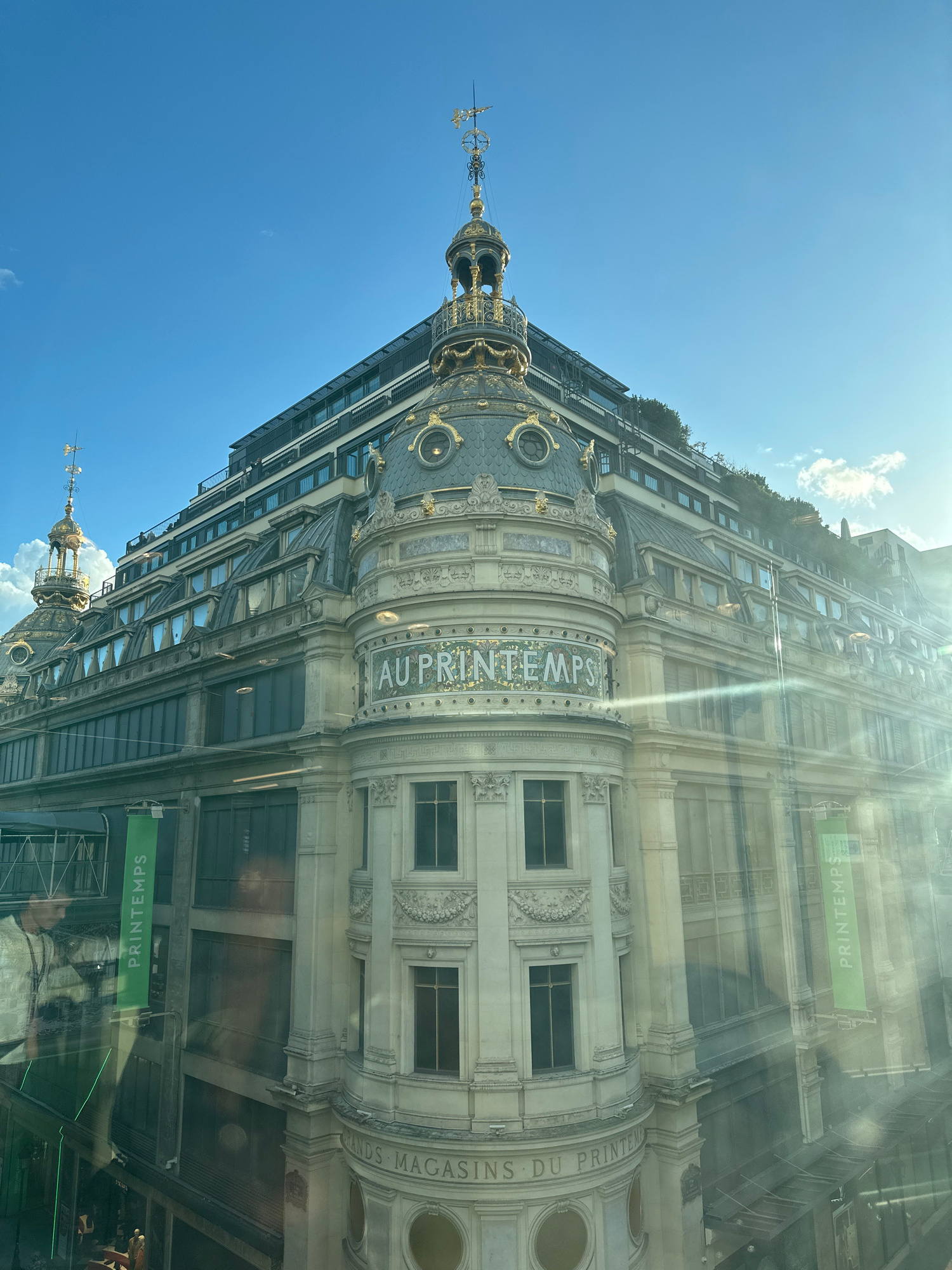 The image shows the Printemps Haussmann department store in Paris, France. The architectural details of the building's exterior are visible, including the dome, ornate decorations, windows, and signagβ¦read more
