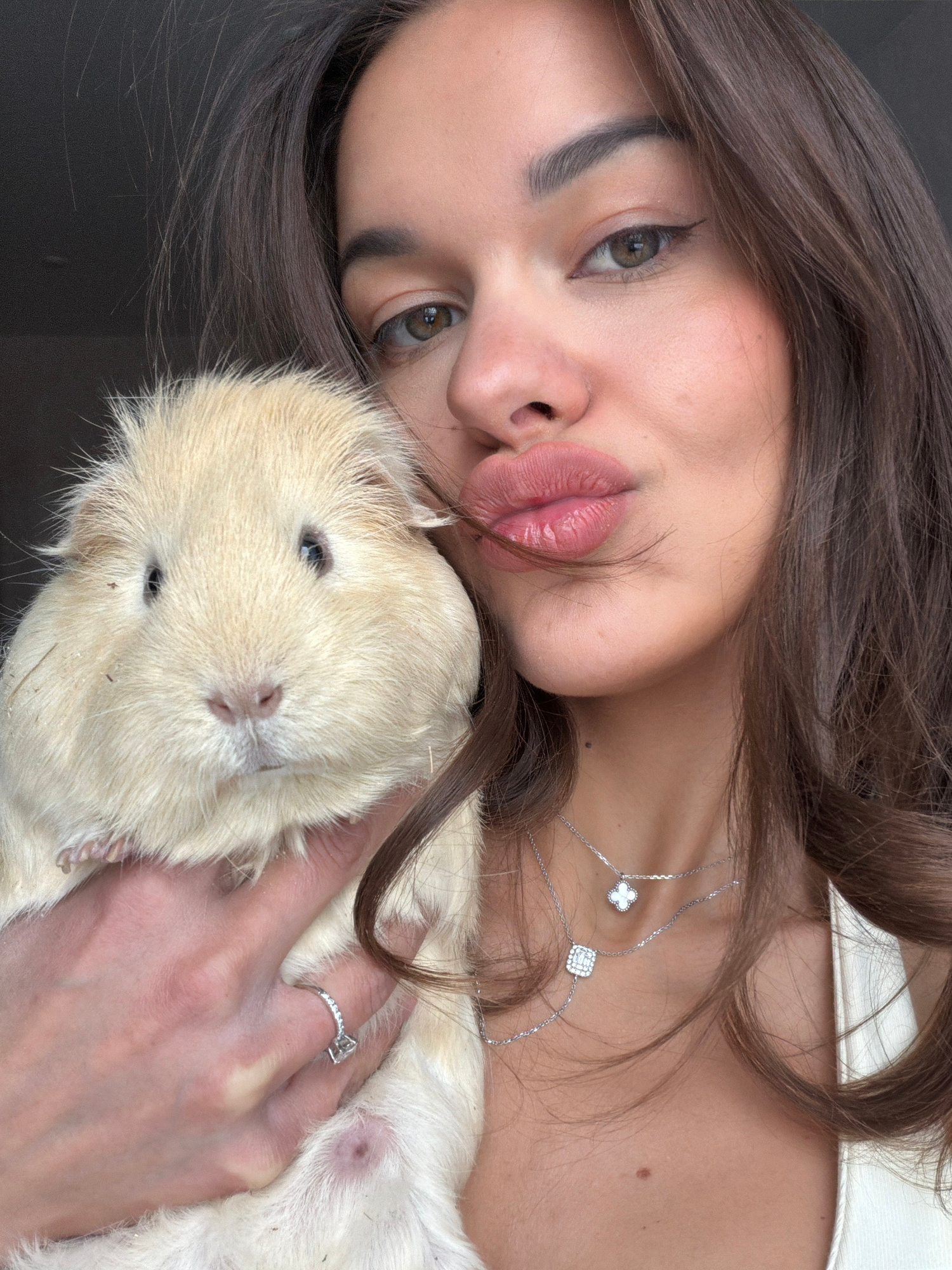 A woman with long brown hair, wearing a silver necklace with clover and square pendants and a ring on her left ring finger, is laying down and holding a light beige guinea pig. The location in the cit…read more