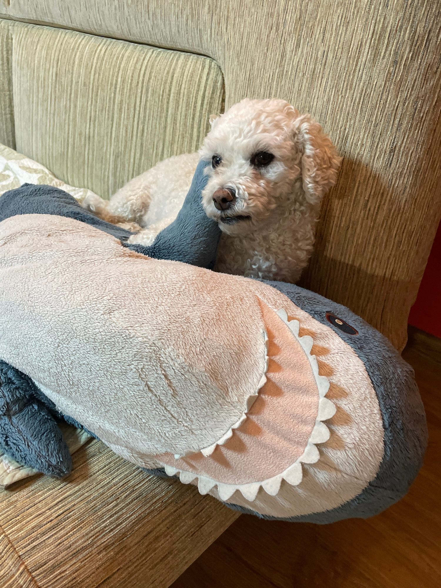 A white toy poodle is lying on a tan couch with a large, plush shark toy. The shark toy is gray and light pink with white felt teeth. The poodle is nestled against the shark, its head facing the camer…read more