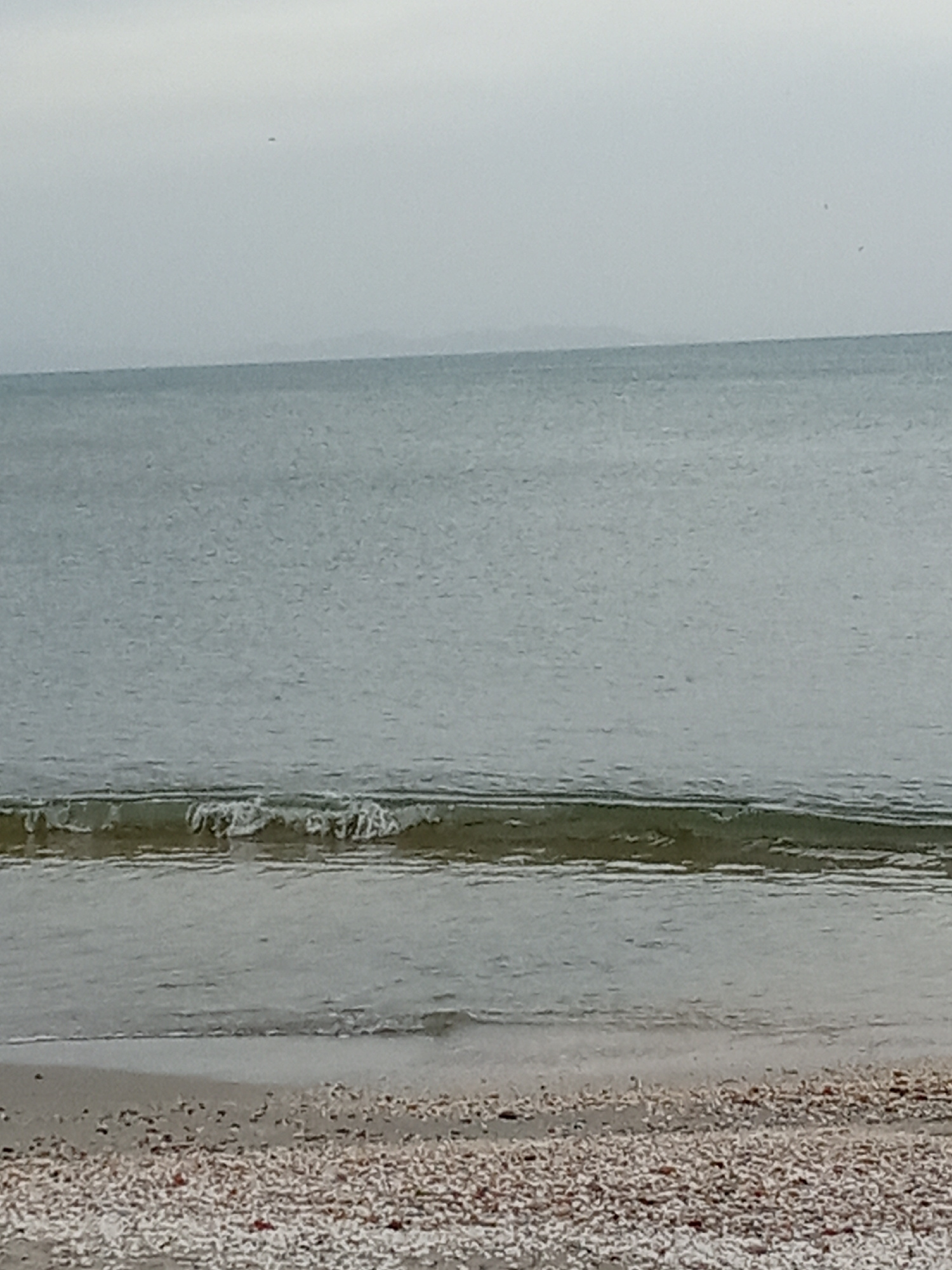 The image shows a beach in Juan Griego, Venezuela, under an overcast sky. The calm, gray-green sea stretches to the horizon where a faint landmass is visible. Gentle waves lap the shoreline, and the b…read more
