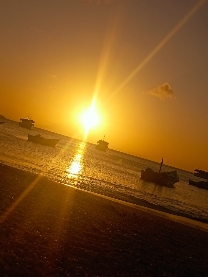 Golden sunset illuminates a beach scene. Several boats are anchored in the calm waters near the shoreline. The sun, a bright focal point, casts long rays across the water and the sand. A single, small…read more