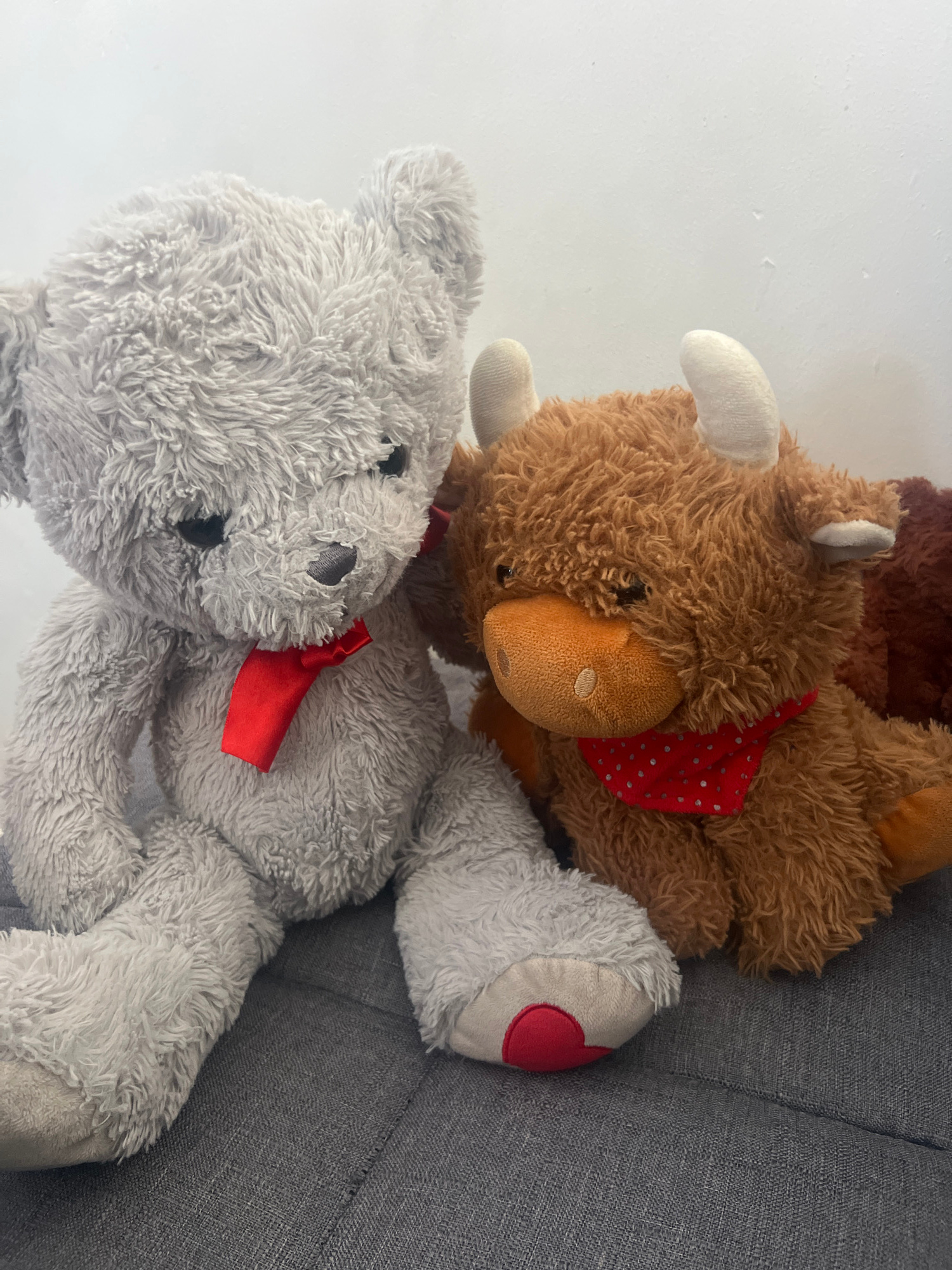 The image depicts two stuffed animals, a brown moose with a red polka-dotted bandana, and a gray teddy bear with a red ribbon, resting on a gray fabric surface. The scene is devoid of human presence a…read more