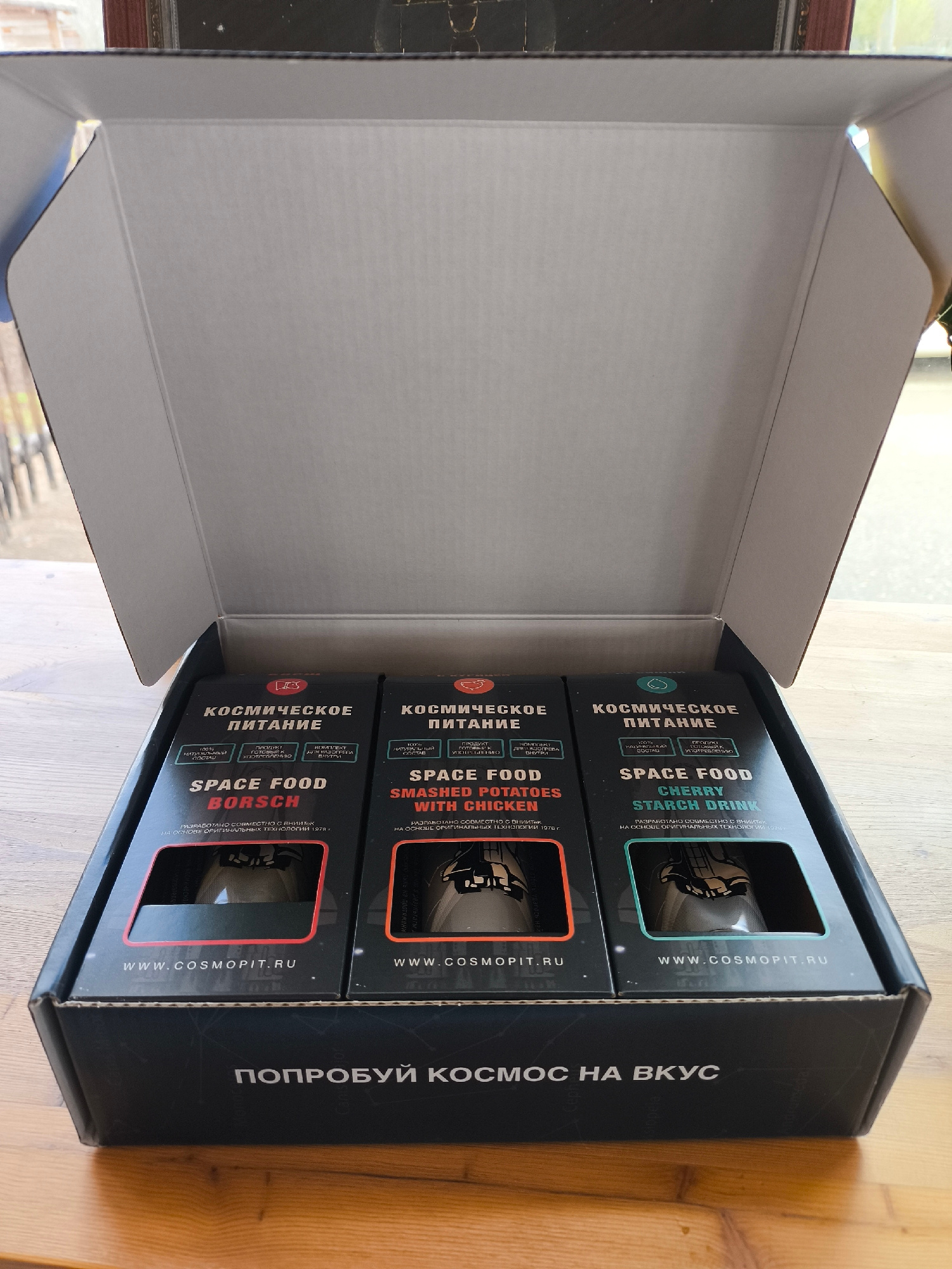 An open cardboard box, likely part of an unboxing, is seen from a slightly elevated angle, revealing three packages of "space food" from the brand "COSMOPIT.RU". The box rests on a light wooden surfac…read more