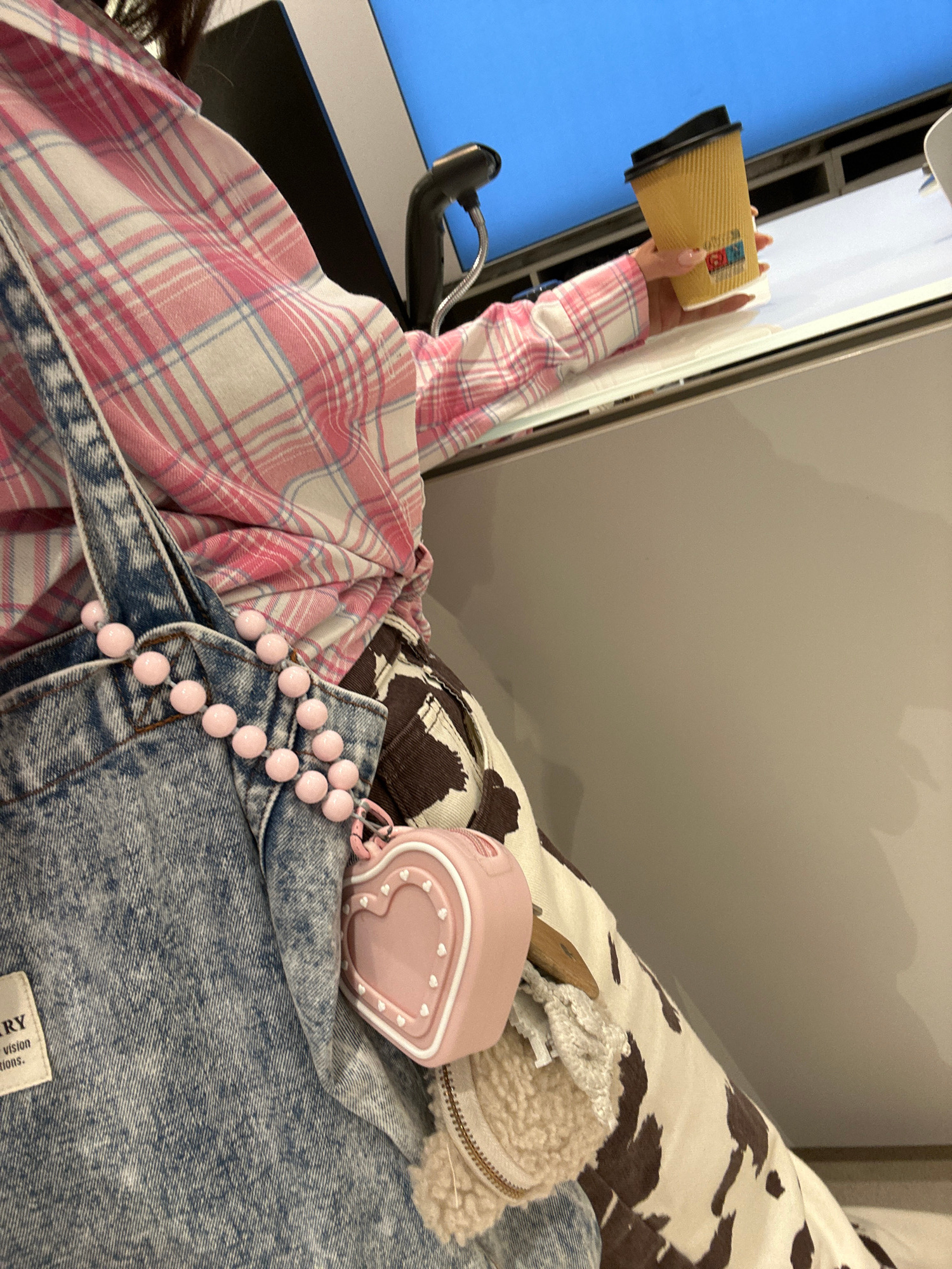The image shows a person indoors, captured from a tilted, overhead perspective. The person's right arm holds a yellow, corrugated paper cup with a black lid, which has a partially visible red and blue…read more