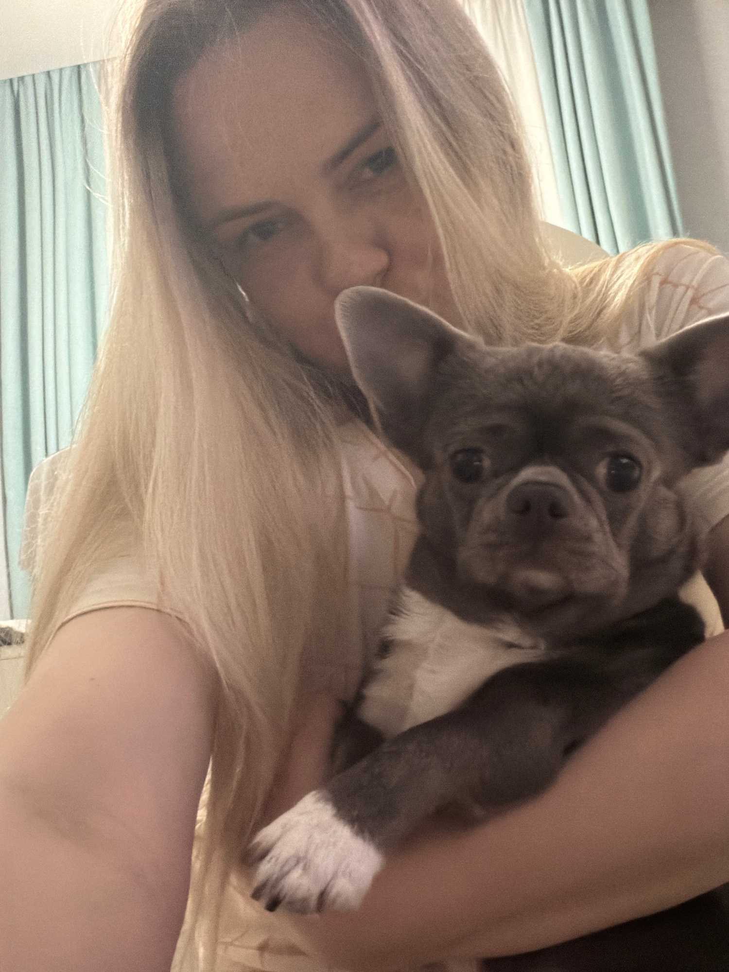 A woman with long blonde hair is holding a gray and white French Bulldog. The dog is resting its head on the woman's shoulder. The background appears to be a room with blue and white striped blinds or…read more