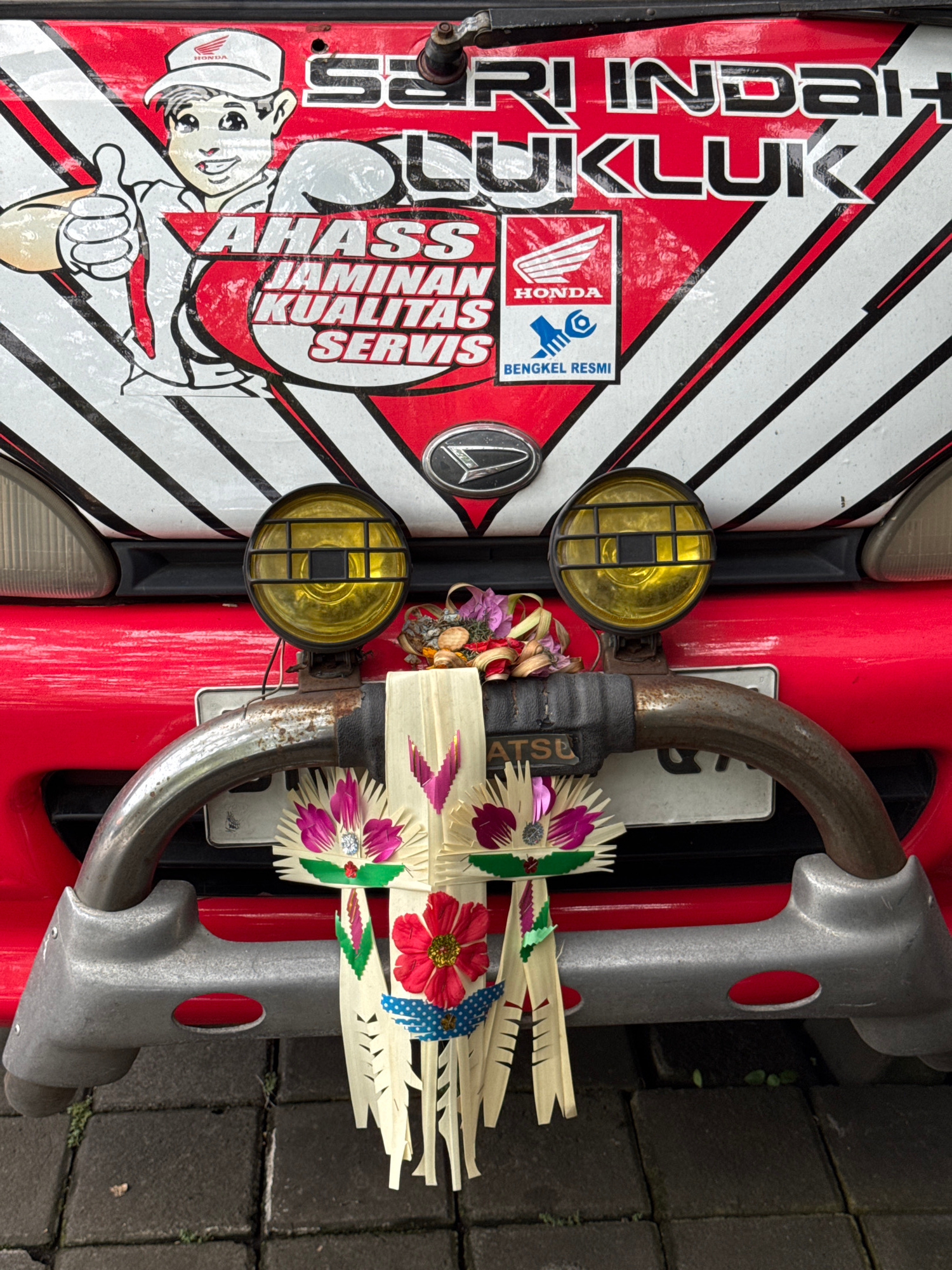 A close-up shot shows the front of a red and white vehicle, likely a motorbike or scooter, in Kuta, Indonesia. The vehicle features a Honda logo and the text "SERI INDAH KLIK" and "AHASS JAMINAN KUALI…read more