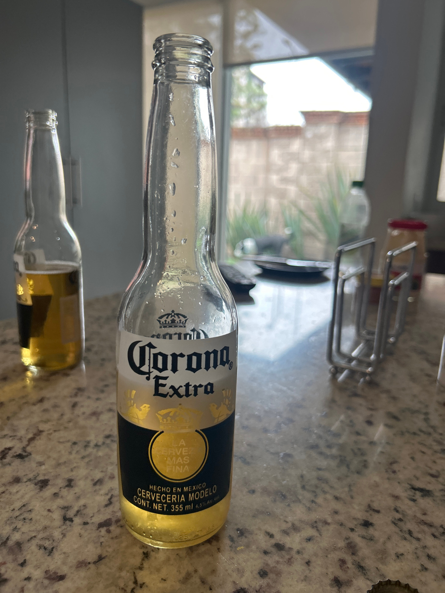 On a speckled, light-colored countertop, an empty Corona Extra beer bottle lies on its side with its neck pointing to the left. Water droplets cling to the clear glass of the bottle's neck and shoulde…read more