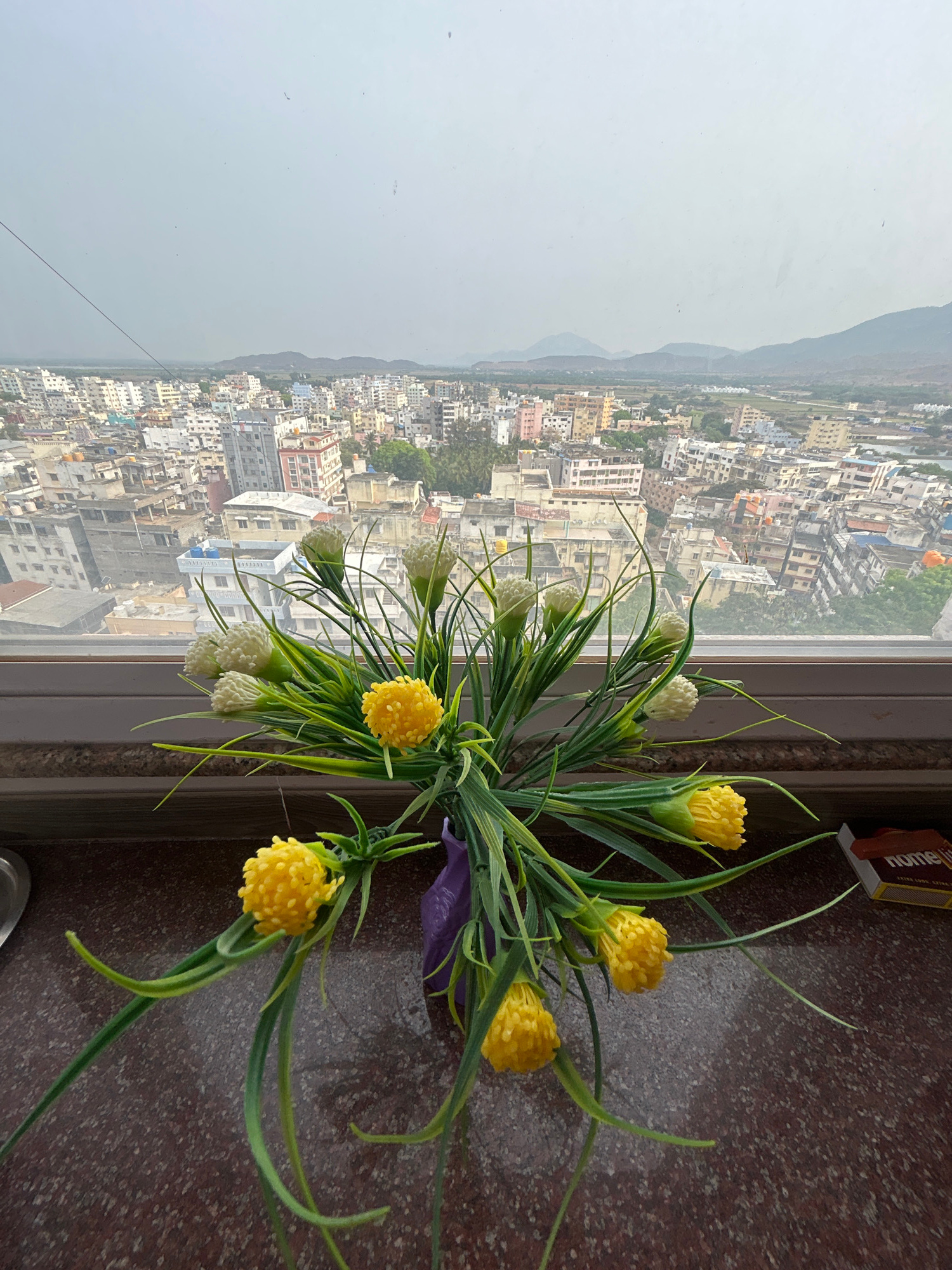 The image shows a bouquet of yellow and white artificial flowers in a purple vase, placed on a windowsill. Outside the window is a cityscape under an overcast sky, with mountains visible in the distan…read more