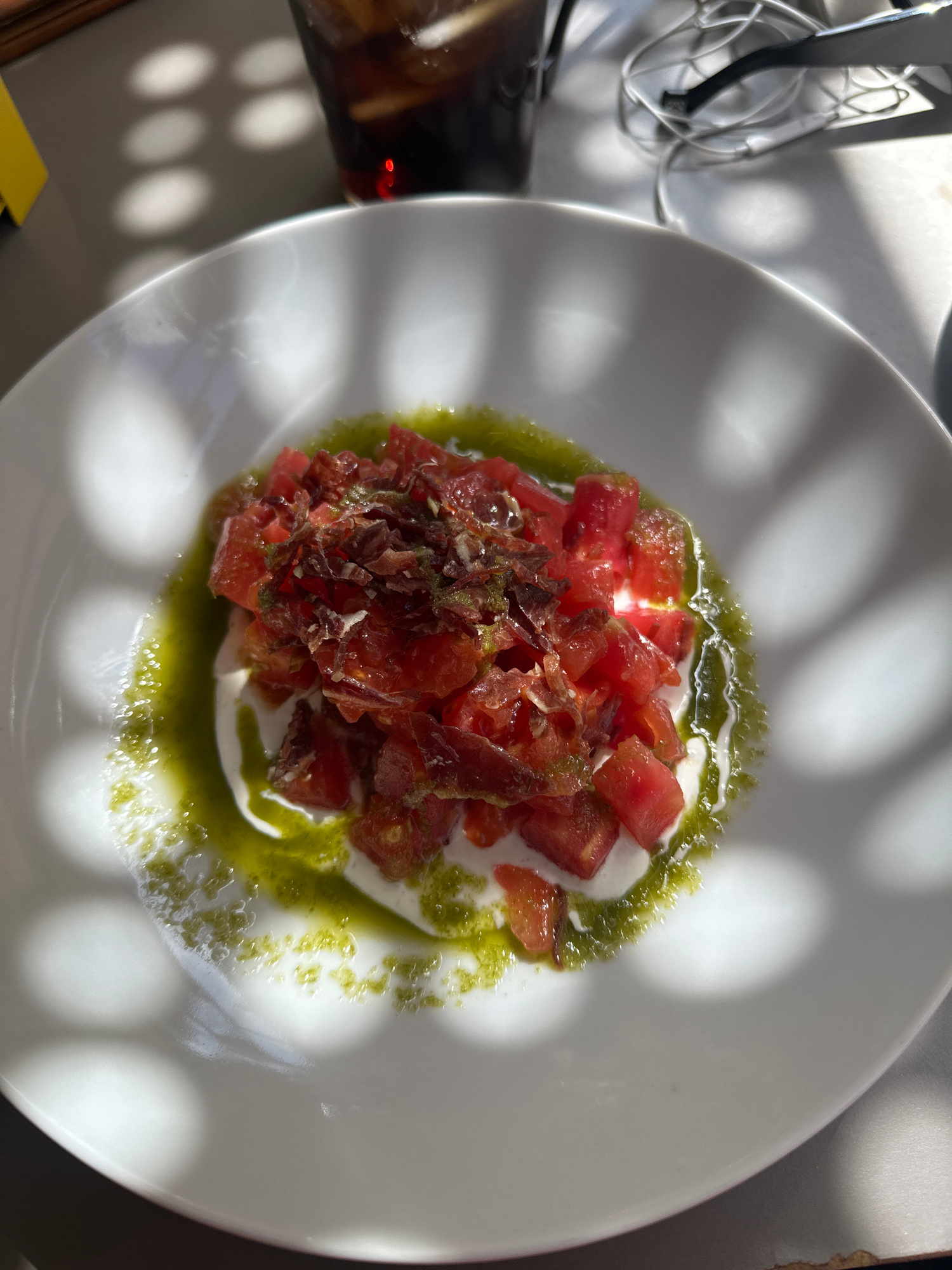 A bright, overhead shot captures a fresh dish served on a white, round plate, set on a light-colored table. The main subject is a culinary creation featuring diced red tomatoes atop a creamy white bas…read more