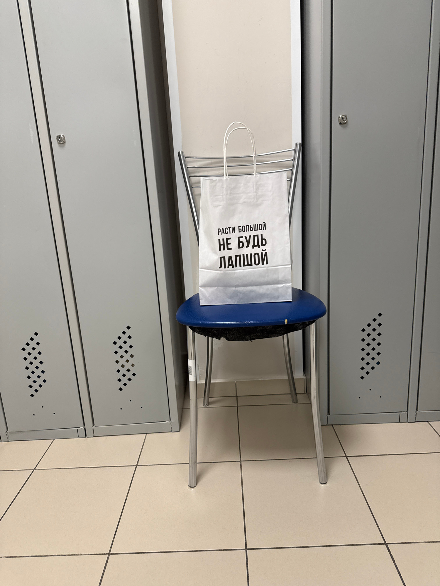 The image captures an indoor scene, likely a locker room or changing area, characterized by rows of grey metal lockers and a tiled floor. The lockers are simple in design, featuring small diamond-shap…read more