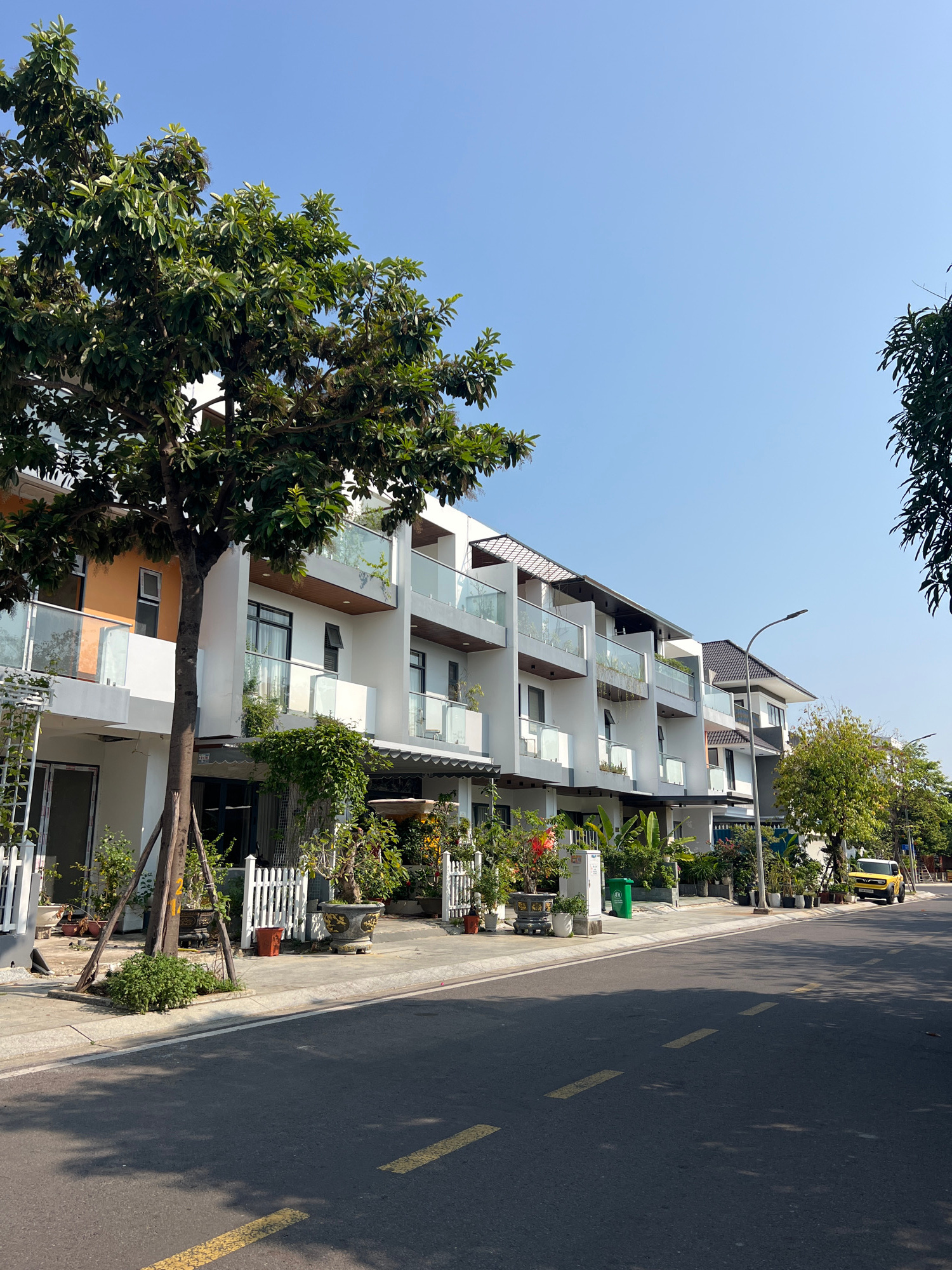 The image captures a bright, sunny daytime scene along an urban street in Nam Natural Heritage Area Trang, Vietnam. On the right side, a row of modern, multi-story buildings line the street. These str…read more