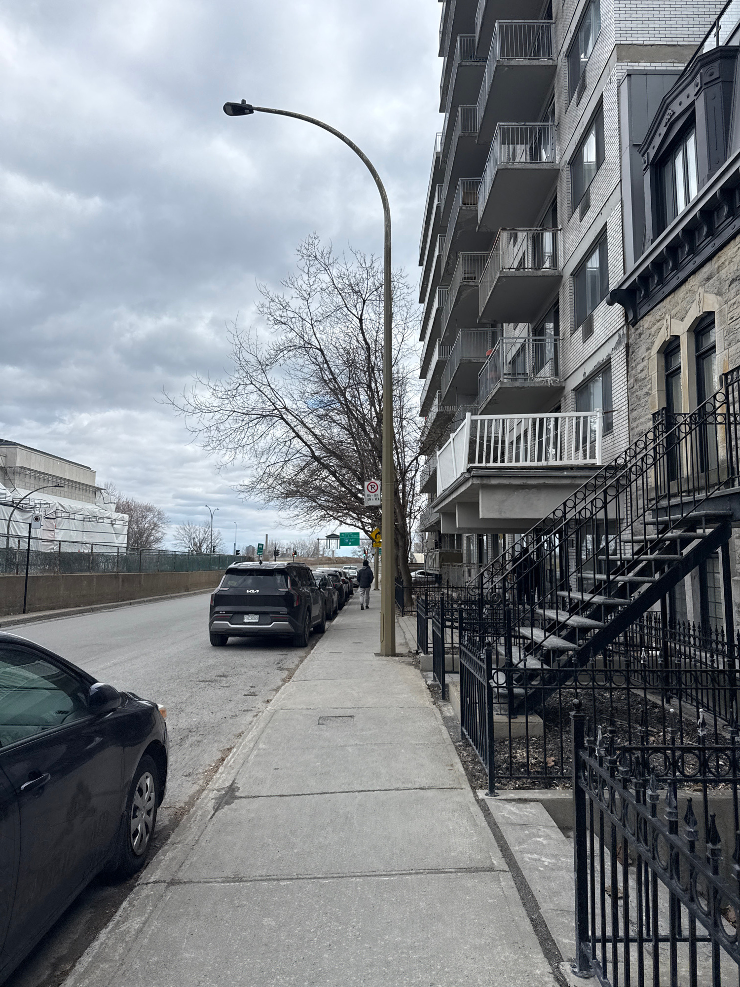 The image depicts a street scene in Montreal, Canada. The perspective is from the sidewalk, looking down a row of parked cars. On the right, a dark-colored car is partially visible. Several vehicles a…read more