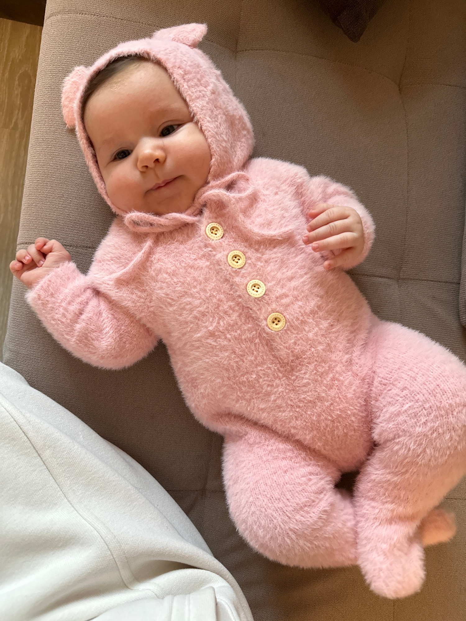 A baby wearing a pink, fuzzy bear-eared hooded jumpsuit with three tan buttons is lying on a tan upholstered surface. The baby's head is slightly tilted. A corner of a white garment is visible in the…read more