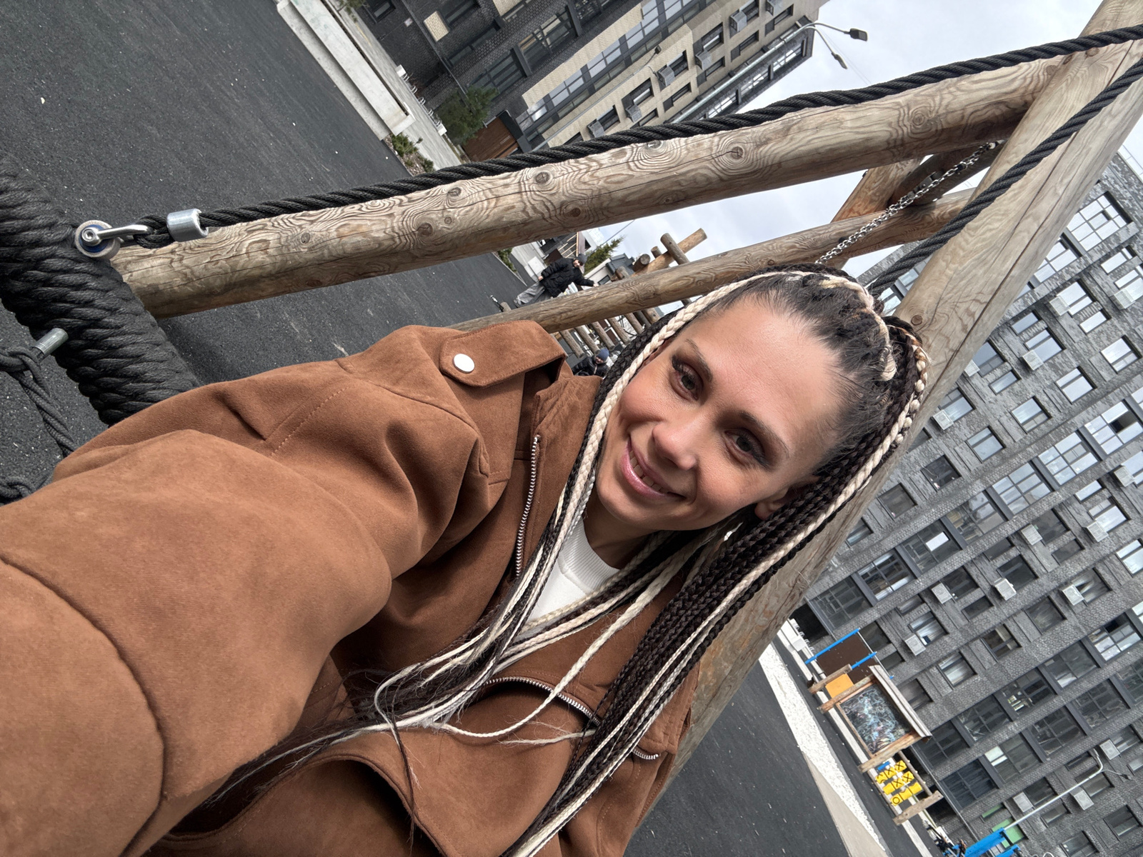 A woman is smiling in an outdoor photo, possibly a selfie, while standing on a wooden structure with thick black ropes. She has braids in her hair and is wearing a brown jacket. The background shows a…read more