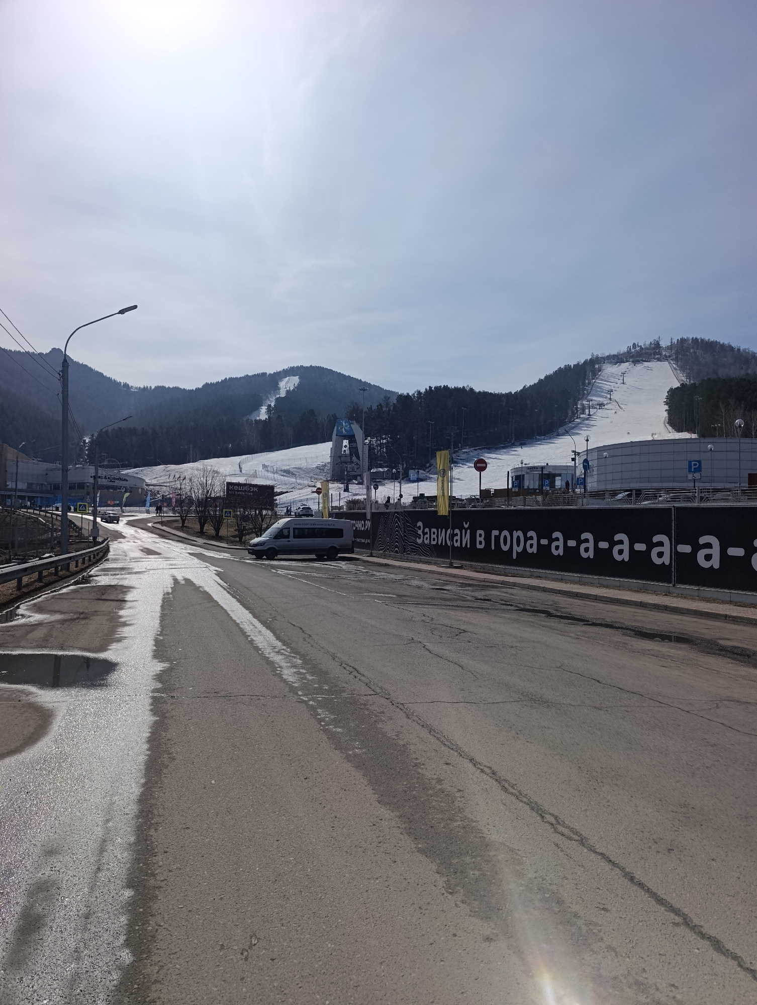 The image captures a street scene in Krasnoyarsk, Russia, featuring the Bobrovy Log Funpark in the background. A wet, asphalt road stretches into the distance, reflecting the overcast sky. A white van…read more