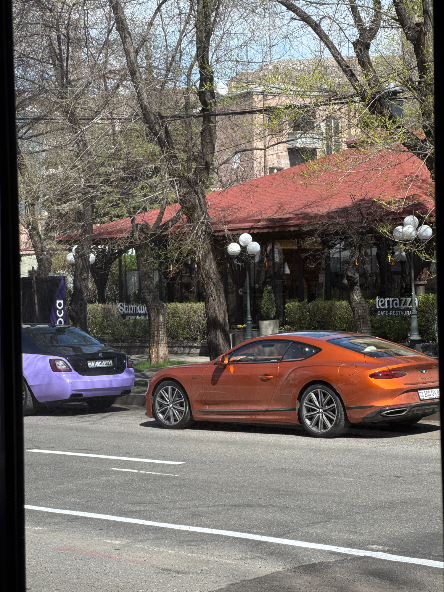 The image shows a view of a street scene from inside a building in Yerevan, Armenia. A rusty-orange Bentley and a purple Citroen DS3 are parked on the right side of the road. The road has white lane…read more