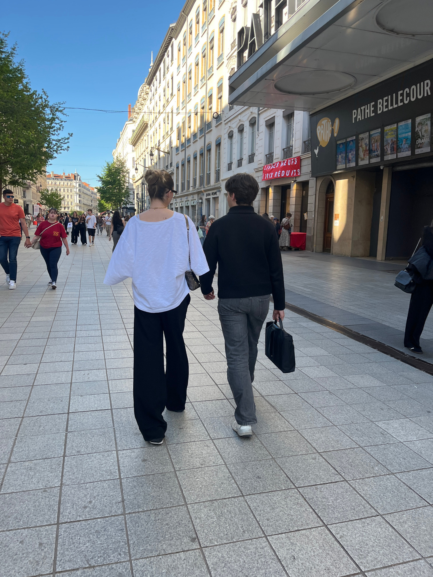 The image depicts a street scene in Lyon, France, identified by the "Pathé Bellecour" cinema signage. Two individuals, a man and a woman, are walking away from the camera on a sidewalk paved with gray…read more