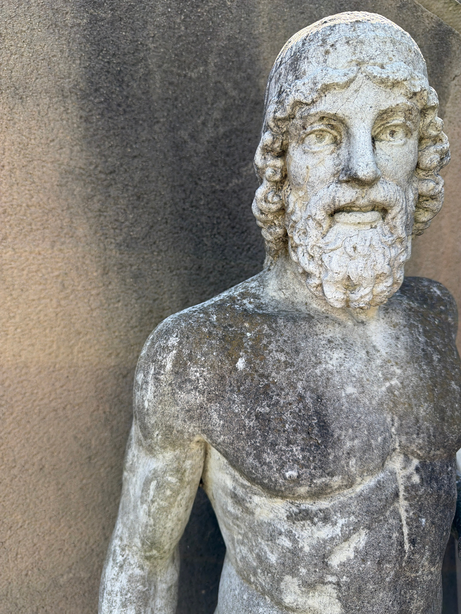 The image shows a weathered stone statue of a male figure, possibly depicting a historical or mythical character. The statue is laying on a textured stone surface. The statue has a detailed head with…read more