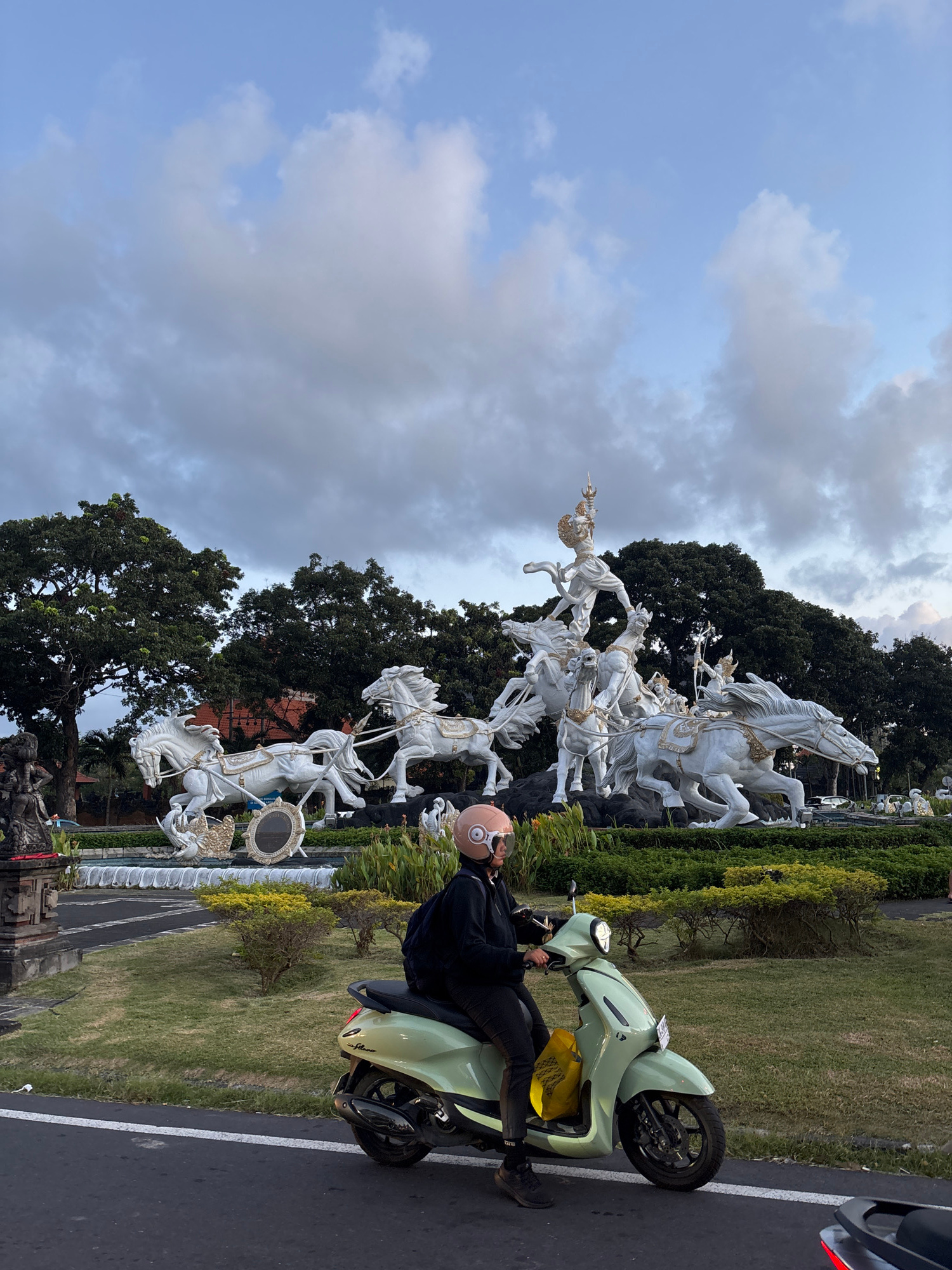 A street scene in Kuta, Indonesia. A light green scooter sits near a concrete curb and a grassy shoulder. A person wearing a pink helmet, dark jacket, and dark pants sits on the scooter. The scooter i…read more