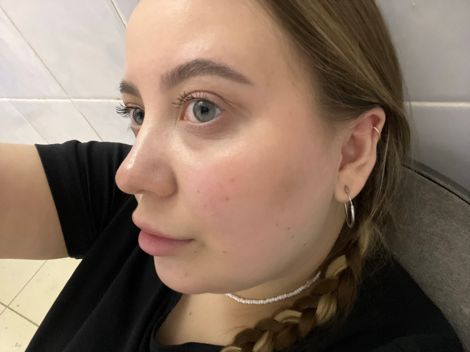 A close-up, tilted portrait of a young woman with light skin and blue eyes. She is wearing a black top. Her hair is braided and she has a small silver earring in her left ear. A beaded white necklace…read more