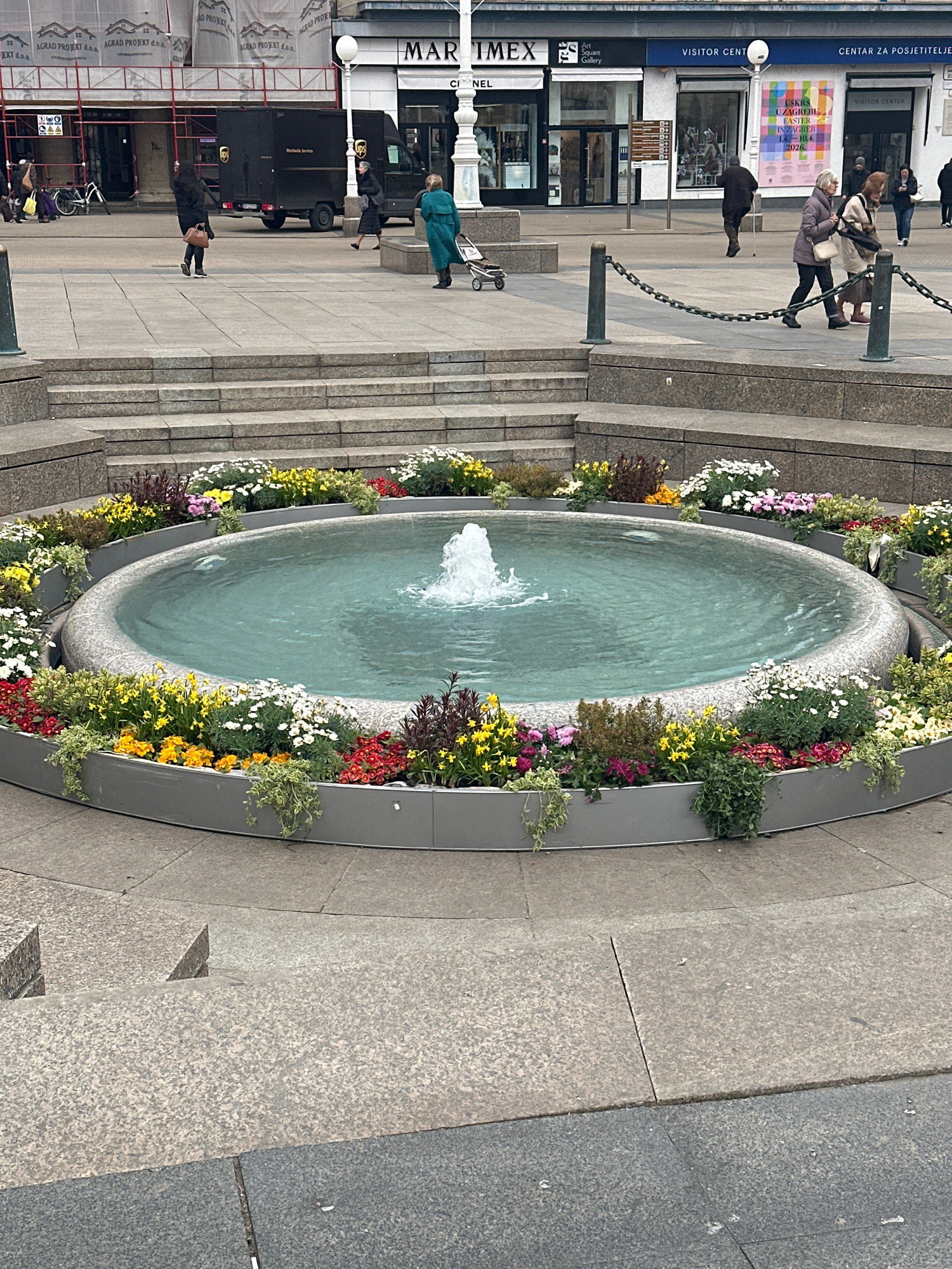 Here's a detailed description of the image: The image shows a public space in the City of Zagreb, Croatia, featuring a large, circular fountain filled with water. A jet of water springs up from the c…read more