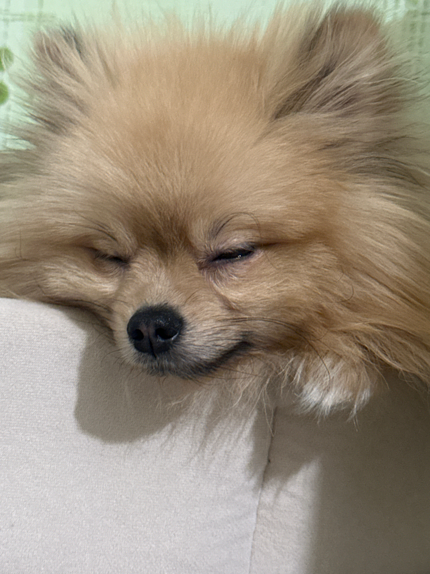 A close-up, rotated, indoor shot of a sleeping Pomeranian dog. The dog, primarily light brown with darker shading around the eyes and nose, is resting its head on a light-colored, possibly beige or of…read more