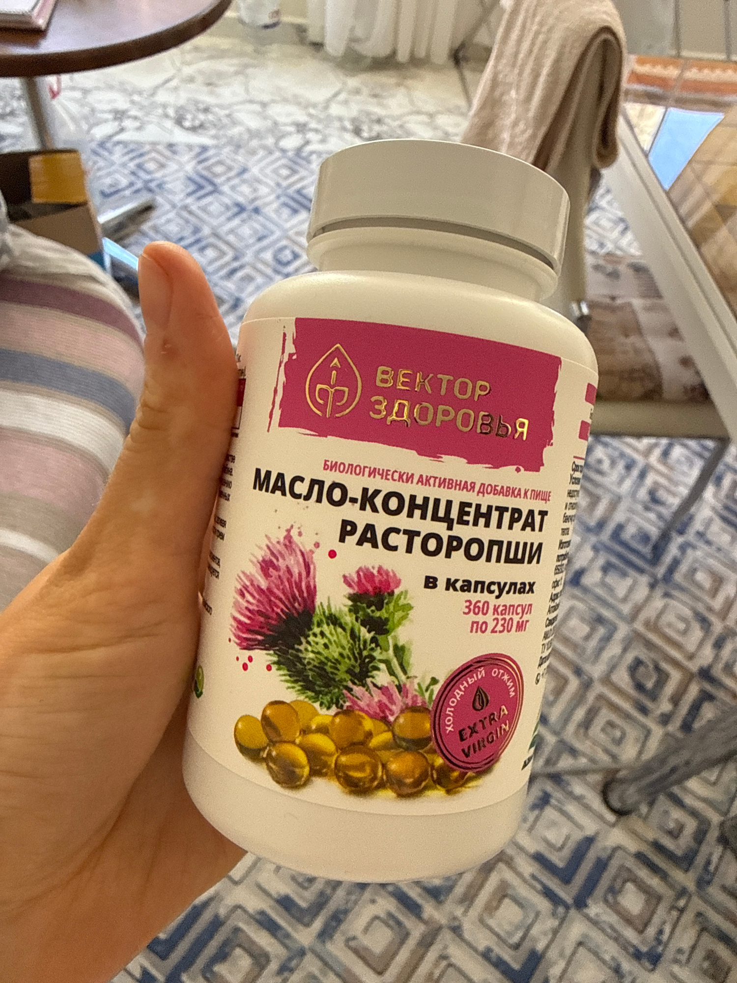 A hand is holding a white plastic bottle with a label written in Russian. The label features the text "ВЕКТОР ЗДОРОВЬЯ МАСЛО-КОНЦЕНТРАТ РАСТОРОПШИ" along with an image of a milk thistle plant and oil…read more