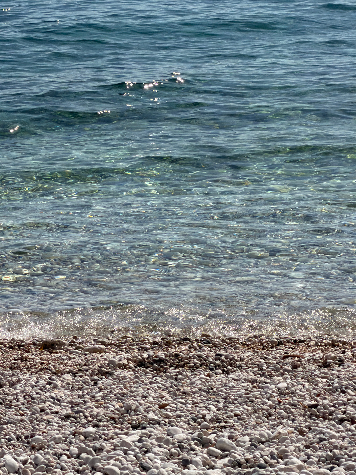 The image displays a serene aerial or overhead view of a clear, calm body of water meeting a pebble beach. The scene is dominated by the natural textures of the water and the shore. The left side of…read more
