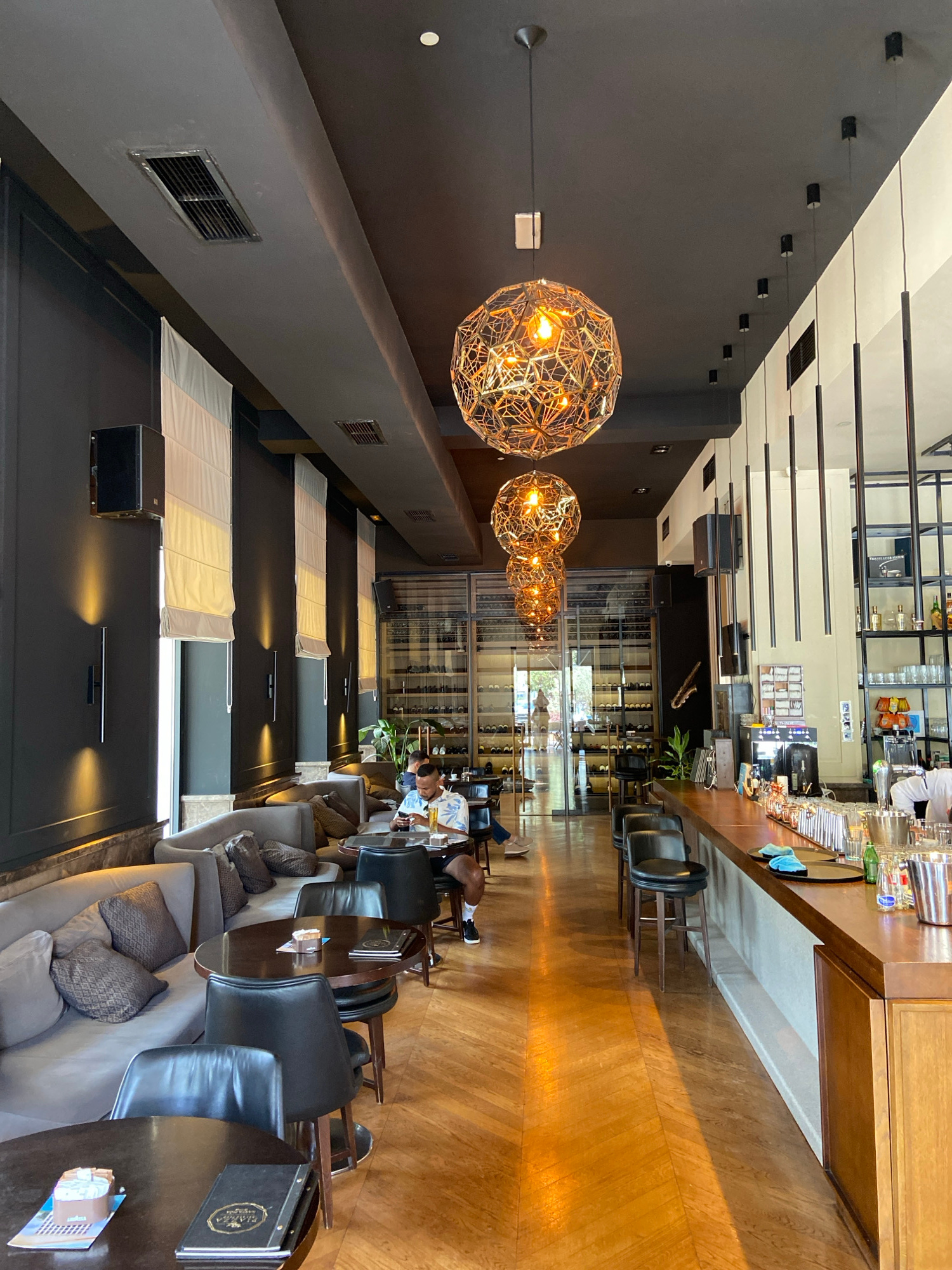 The image captures the interior of a modern and sophisticated bar or lounge, rotated vertically. The setting features a long wooden bar counter on the right side, stocked with various bottles, glasswa…read more