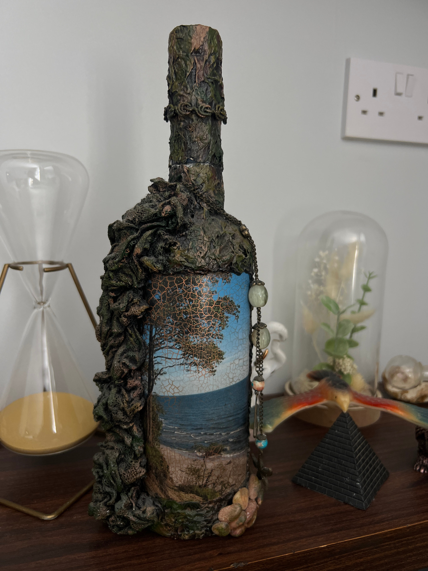 The image depicts an intricately decorated bottle on a shelf or table. The bottle is adorned with textured, dark green and brown material, possibly resembling sculpted clay or similar substance, cover…read more