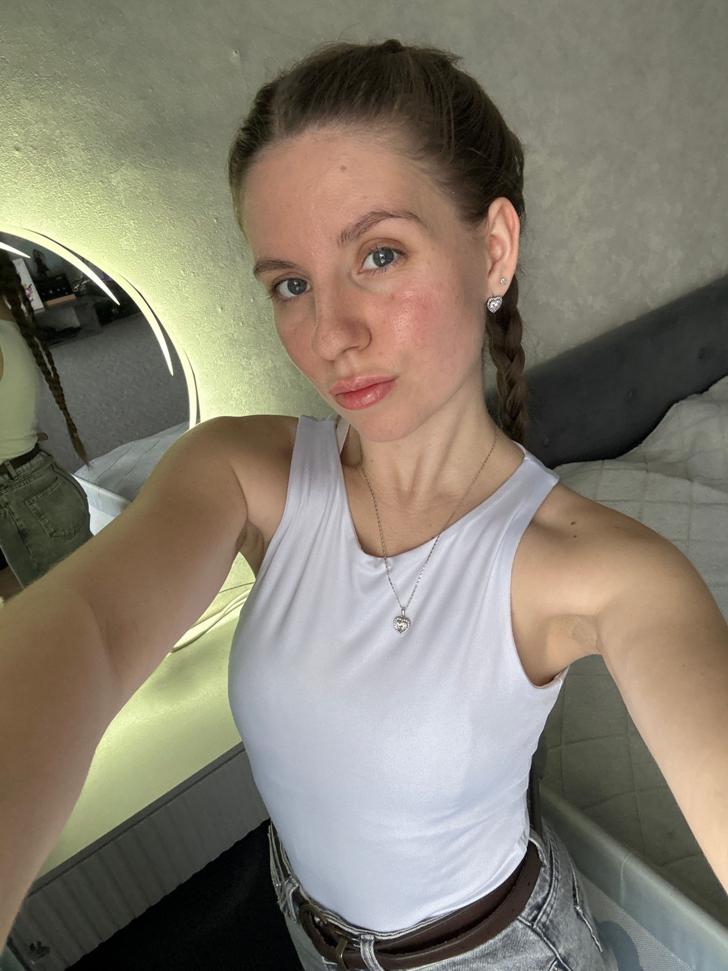 A young woman is shown in a selfie. She has light skin, blue eyes, and her hair is styled in braids. She is wearing a white tank top and a silver necklace. A brown belt is visible on her waist and sheβ¦read more