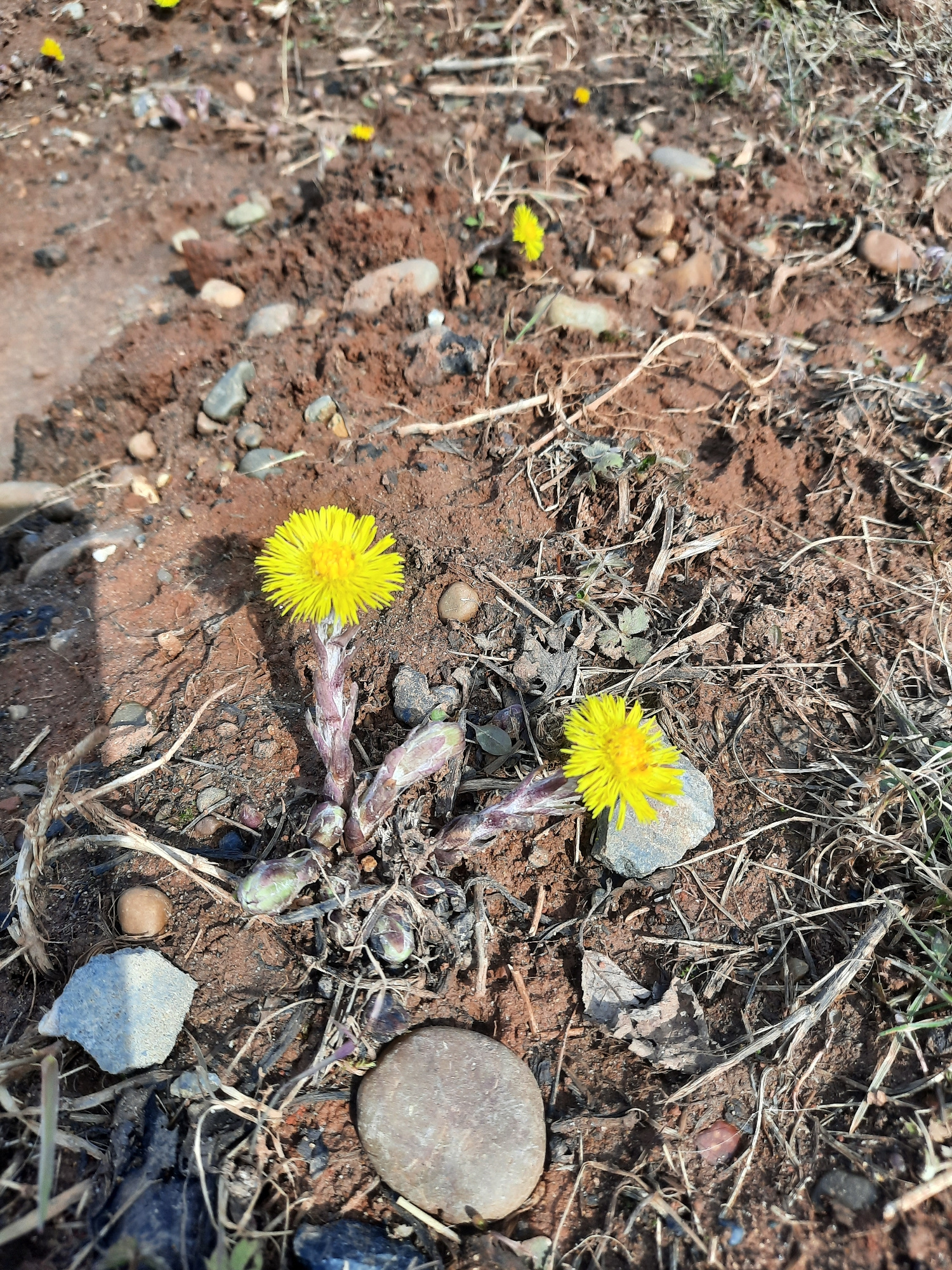 The image shows two bright yellow flowers, likely coltsfoot, growing out of reddish-brown soil mixed with small rocks and dry plant debris. The flowers are centrally located in the frame. One cluster…read more
