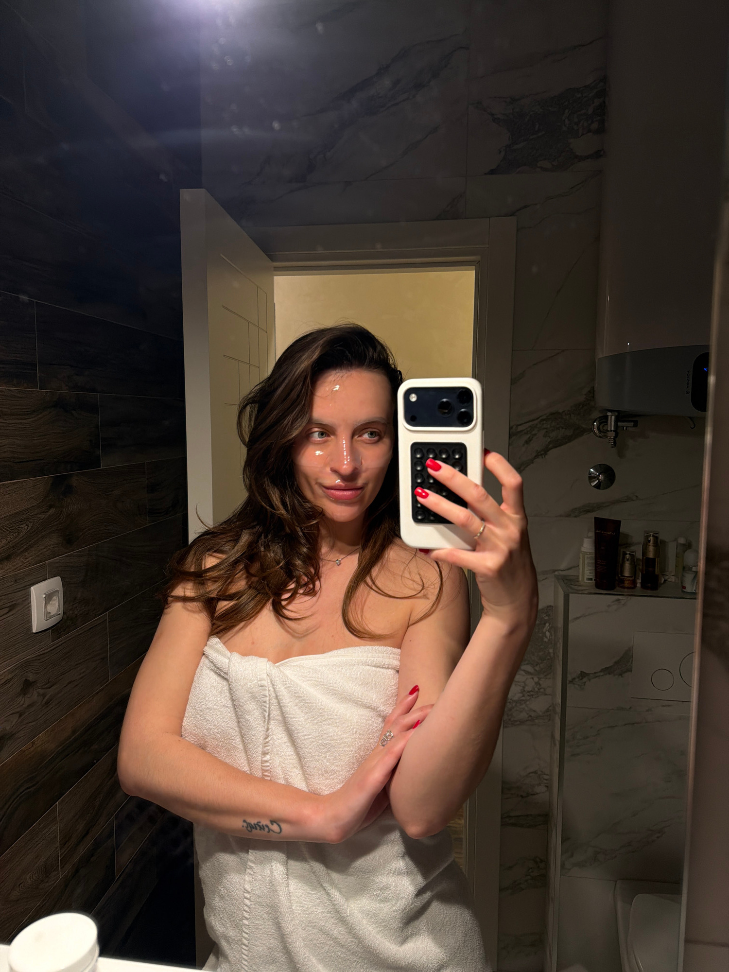 A young woman is taking a selfie in a bathroom. The woman is partially wrapped in a white towel. She is holding a smartphone with a white case. There are water droplets on her face. The bathroom has d…read more
